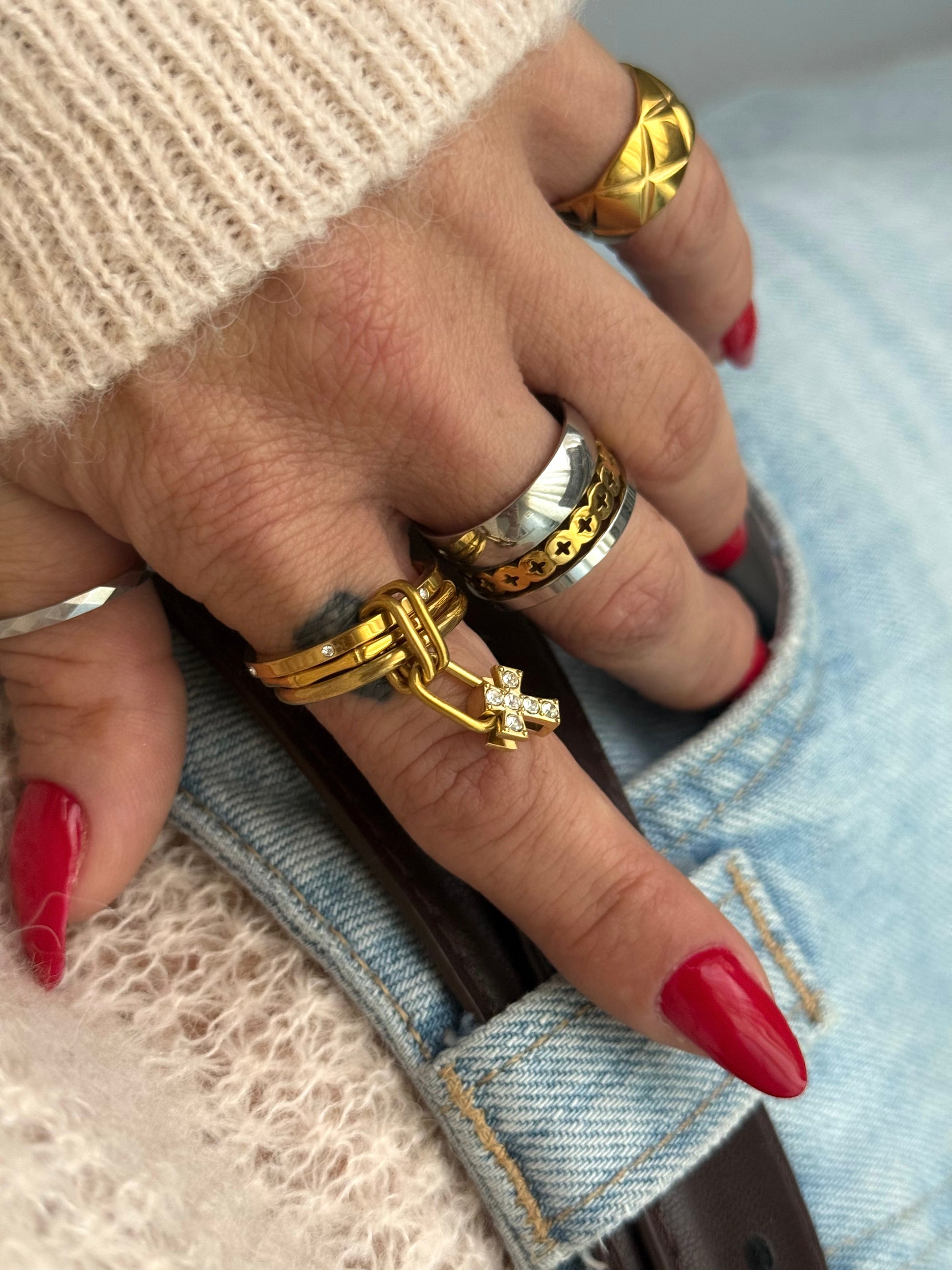 Το Blessed Bands συνδυάζει τη λάμψη του χρυσού με τη συμβολική λεπτομέρεια του σταυρού — ένα δαχτυλίδι που αποπνέει πίστη, ισορροπία και στυλ.
