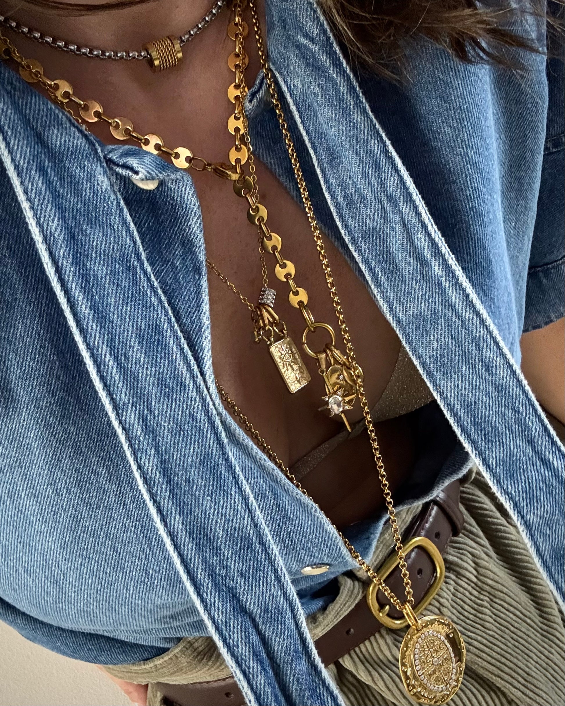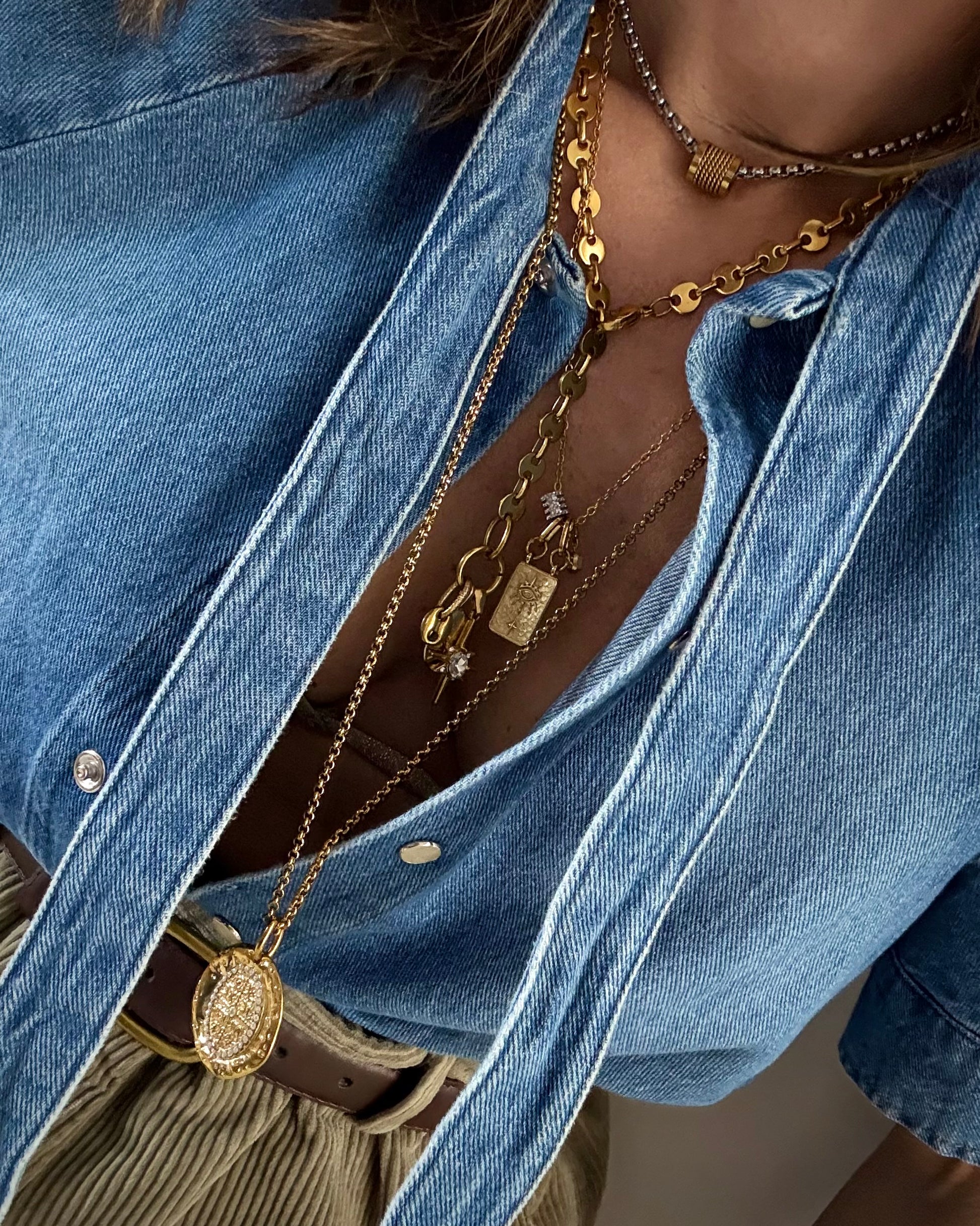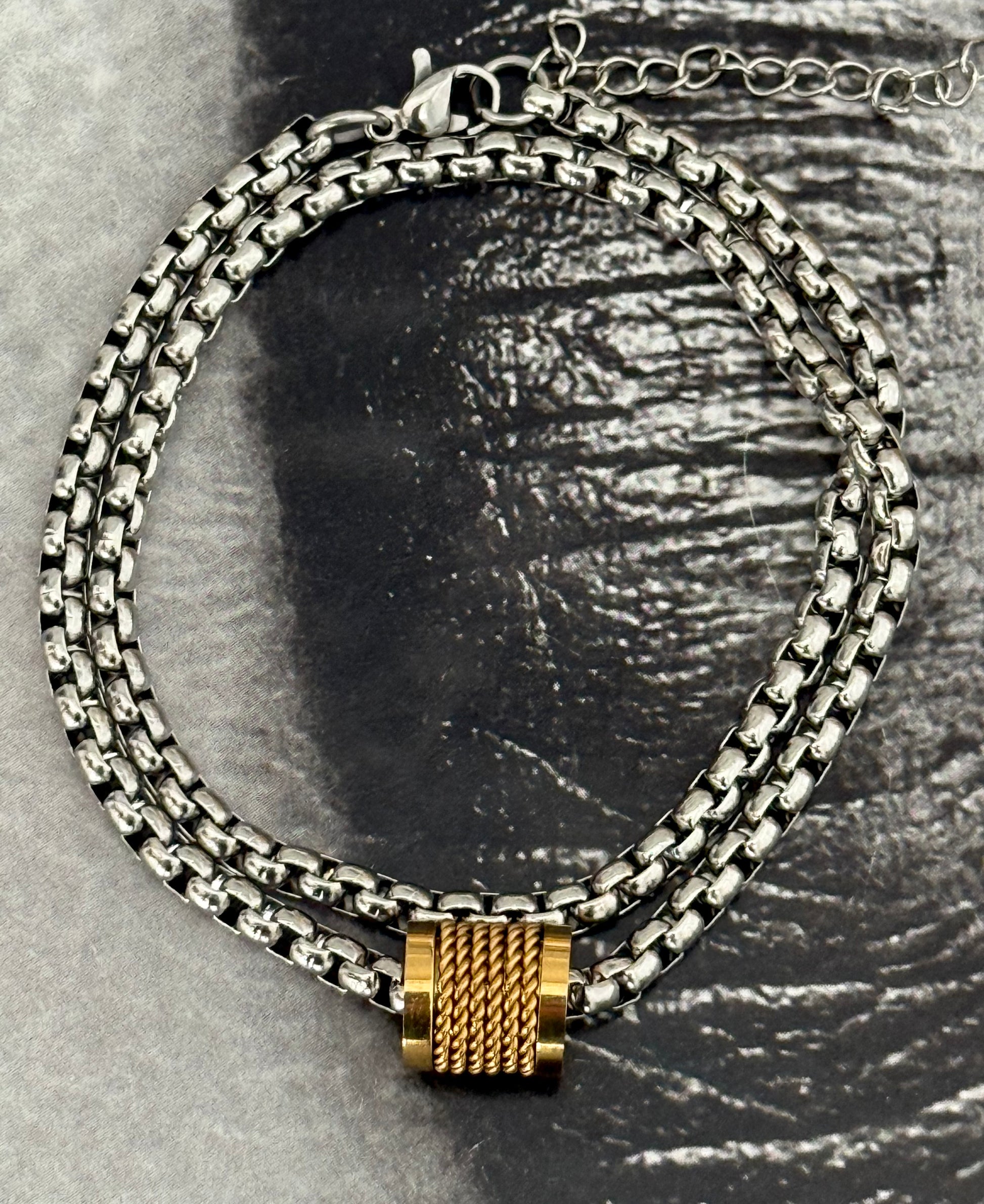 Κοντό κολιέ με box chain αλυσίδα και ιδιαίτερη μεταλλική λεπτομέρεια στο κέντρο. Φοριέται και ως διπλό βραχιόλι, προσαρμόζοντας το στιλ σου ανάλογα με τη διάθεση. Ένα ευέλικτο κόσμημα που συνδυάζει δυναμισμό και minimal αισθητική.