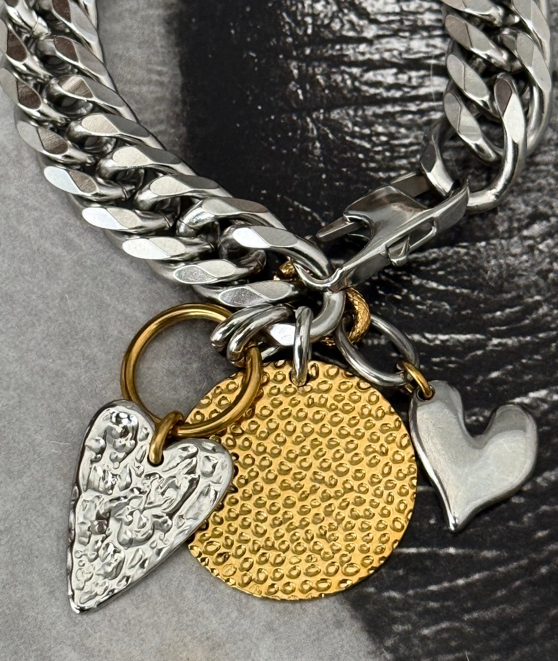 Chunky βραχιόλι με αλυσίδα και mix charms που δίνουν μοναδικό χαρακτήρα. Οι ασημί καρδιές σε συνδυασμό με τον χρυσό δίσκο δημιουργούν ένα παιχνιδιάρικο αλλά ταυτόχρονα δυναμικό αποτέλεσμα που ξεχωρίζει.