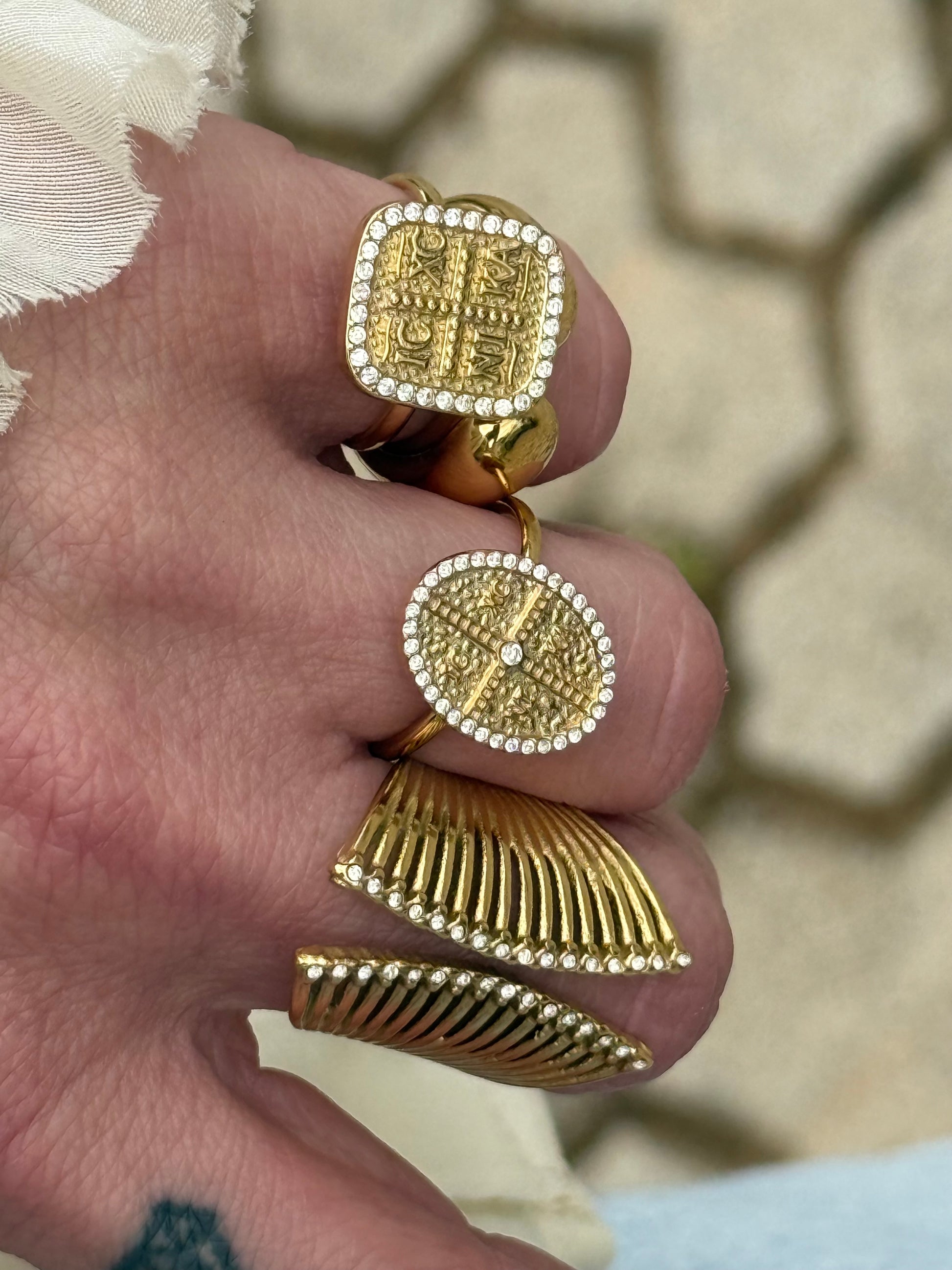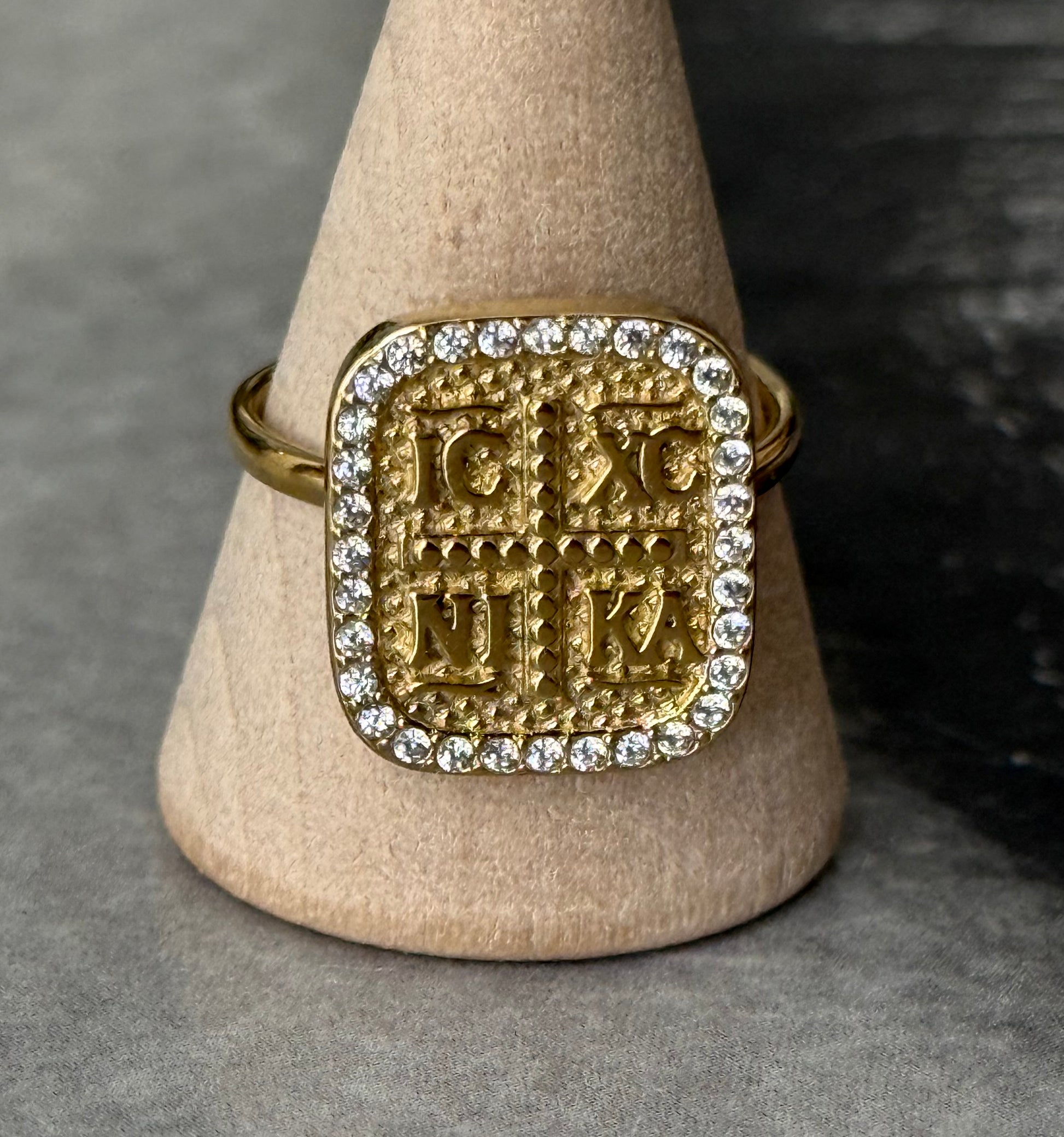 Minimal αλλά έντονο, αυτό το τετράγωνο δαχτυλίδι με σταυρό στο κέντρο συνδυάζει καθαρό σχεδιασμό και συμβολισμό. Ιδανικό για καθημερινό layering ή ως statement λεπτομέρεια που ξεχωρίζει χωρίς υπερβολές.