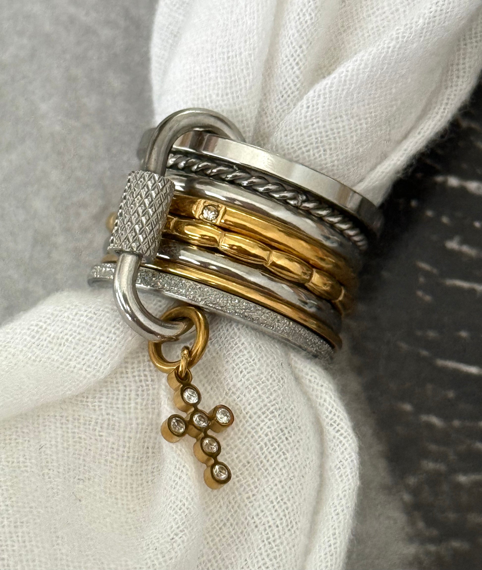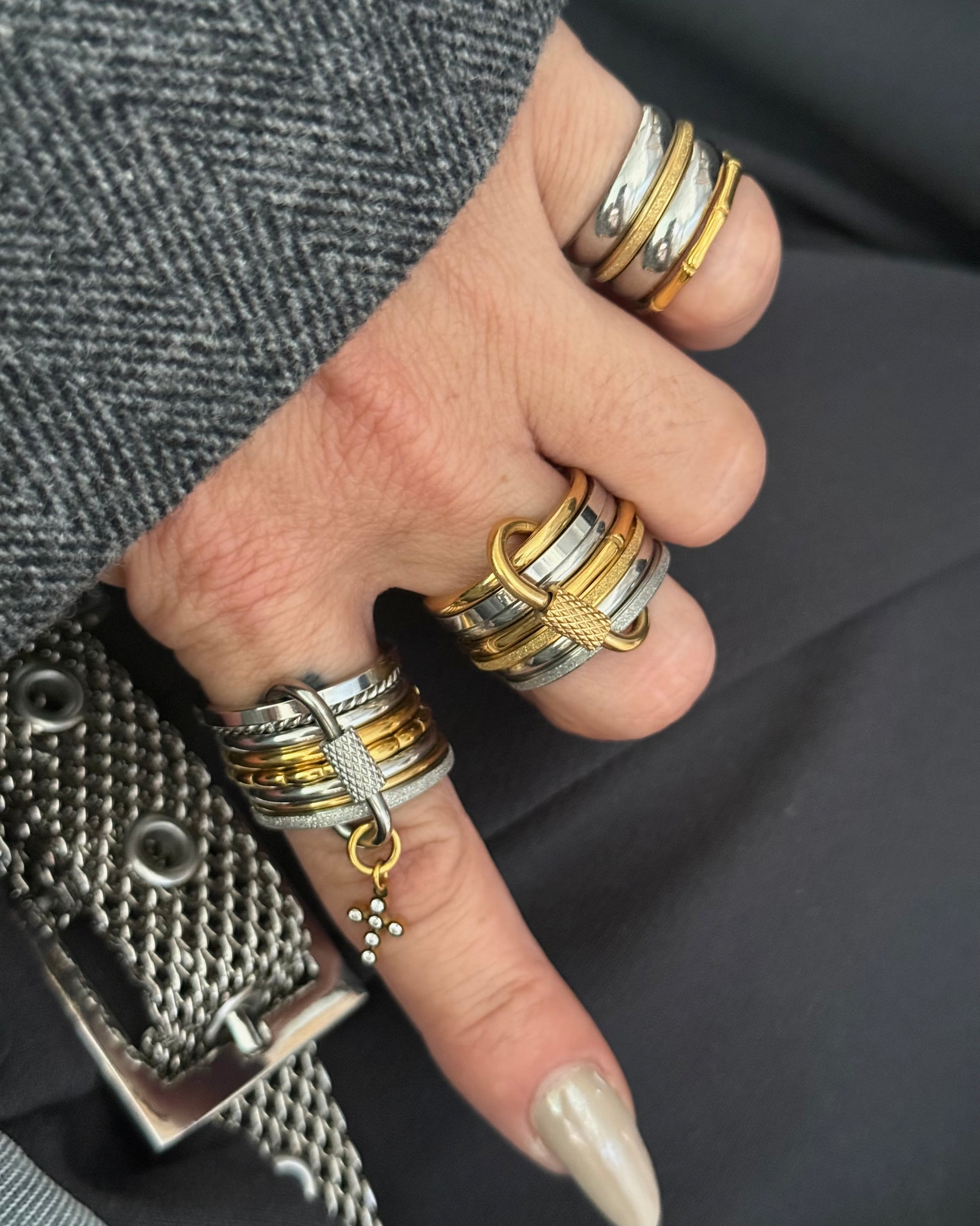 Αποτελείται από 8 διαφορετικά σχέδια σε αποχρώσεις ασημί και χρυσού, δεμένα μεταξύ τους με μεταλλικό κρίκο που ολοκληρώνει το σύνολο με industrial αισθητική.Το διακριτικό charm με σταυρό προσθέτει κίνηση και λάμψη.Ένα κόσμημα με προσωπικότητα — το φοράς ενιαίο, το νιώθεις ξεχωριστό.