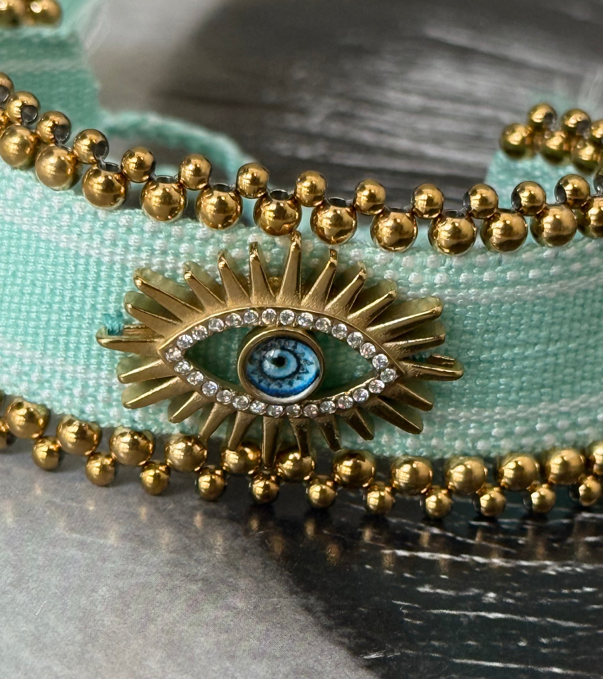 Καλοκαιρινό υφασμάτινο βραχιόλι σε δροσερή mint απόχρωση, με διακριτικές χρυσές λεπτομέρειες και eye charm που ξεχωρίζει. Ελαφρύ, άνετο και απόλυτα ευέλικτο, προσαρμόζεται εύκολα σε κάθε καρπό χάρη στο ρυθμιζόμενο δέσιμο.