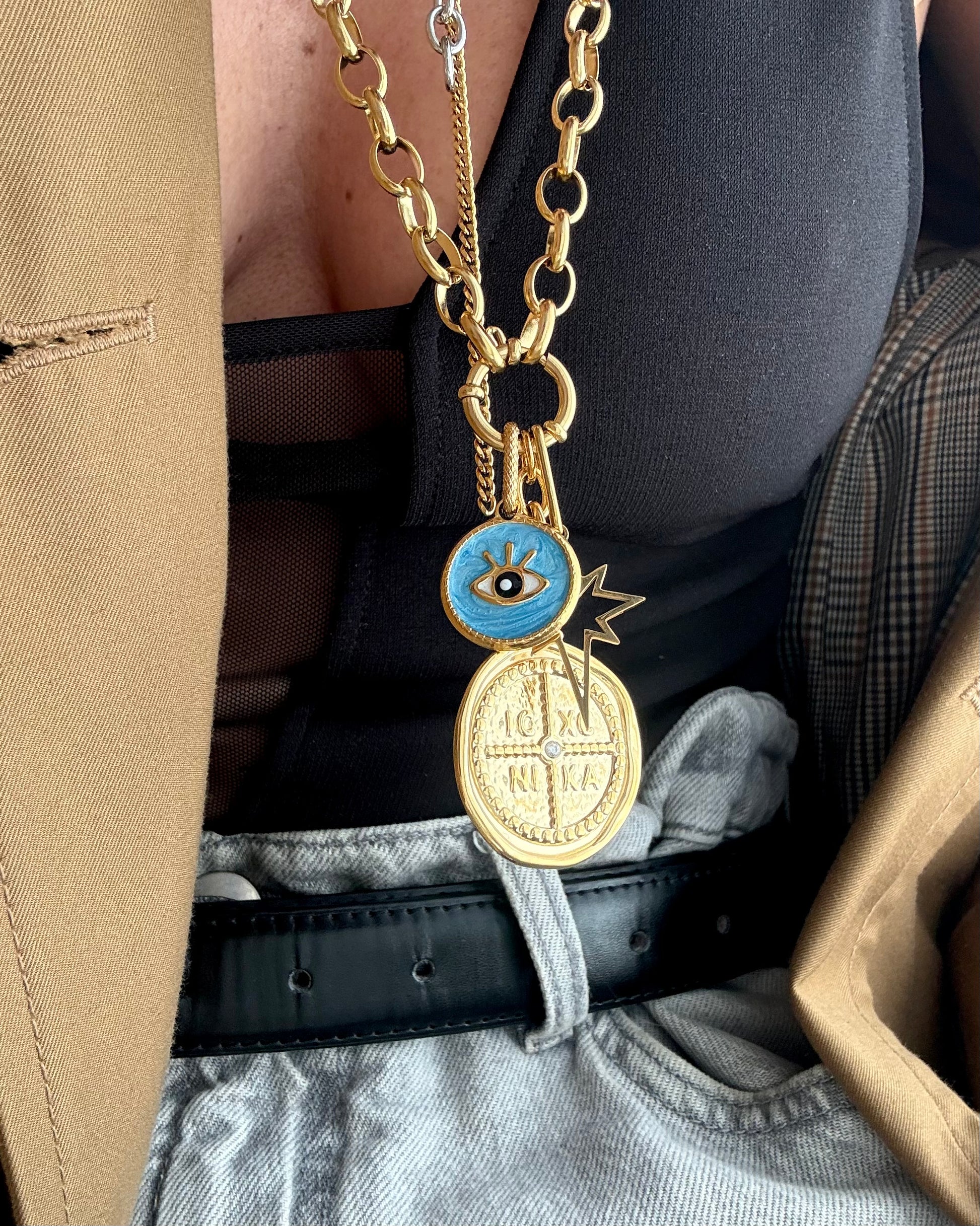 Ένα statement κολιέ με charms που ξεχωρίζουν — μάτι για προστασία, νόμισμα και αστέρι για λάμψη — γίνεται το απόλυτο κομμάτι που απογειώνει κάθε look.