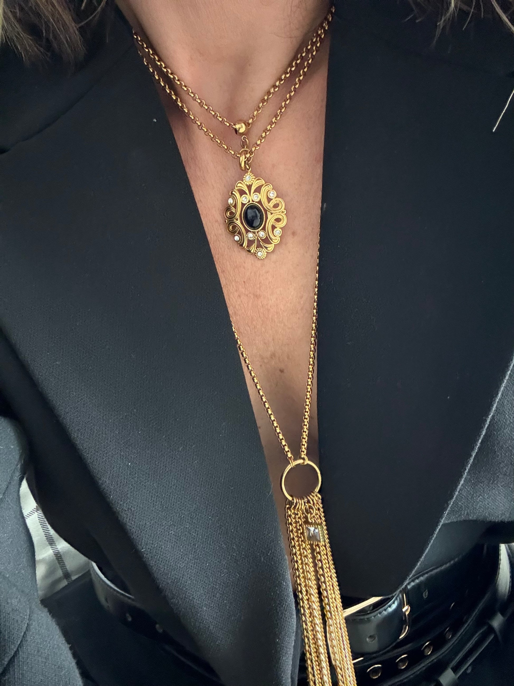Statement κολιέ με vintage αισθητική και μαύρη πέτρα που εκπέμπει μυστήριο και κομψότητα.Φόρεσέ το πάνω από ζιβάγκο για ένα refined look ή με ανοιχτό πουκάμισο για bold αντίθεση και ένταση στο στυλ.
