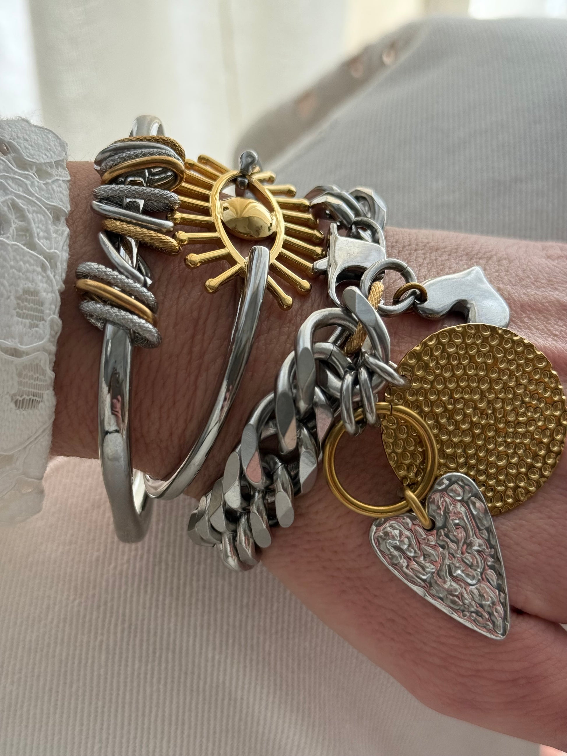 Minimal bangle με διακριτική κίνηση μέσα από τα μεταλλικά στοιχεία που “αγκαλιάζουν” το σχέδιο. Ο δίχρωμος συνδυασμός δίνει μοντέρνο χαρακτήρα και κάνει το κόσμημα να ξεχωρίζει χωρίς υπερβολές.