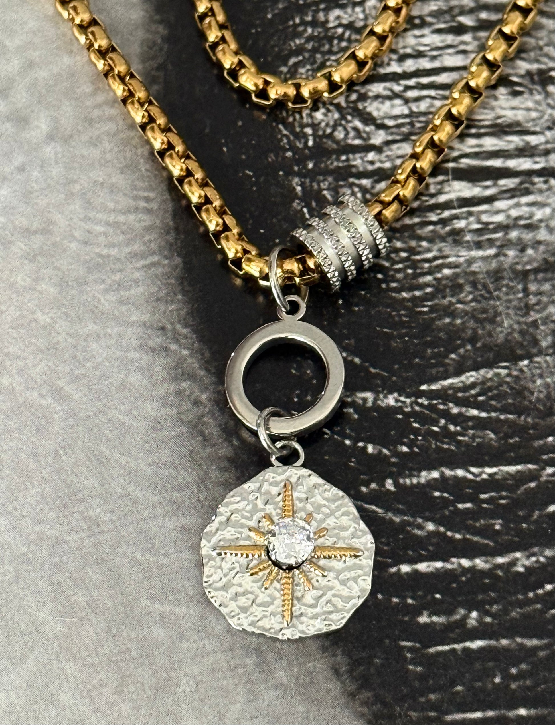Μακρύ κολιέ με εντυπωσιακή χρυσή αλυσίδα και σφυρήλατο μενταγιόν που θυμίζει αστέρι. Το κέντρο του στολίζεται με λαμπερή πέτρα, προσθέτοντας διακριτική λάμψη σε κάθε εμφάνιση. Ιδανικό για layering ή για να φορεθεί μόνο του σαν statement κομμάτι.