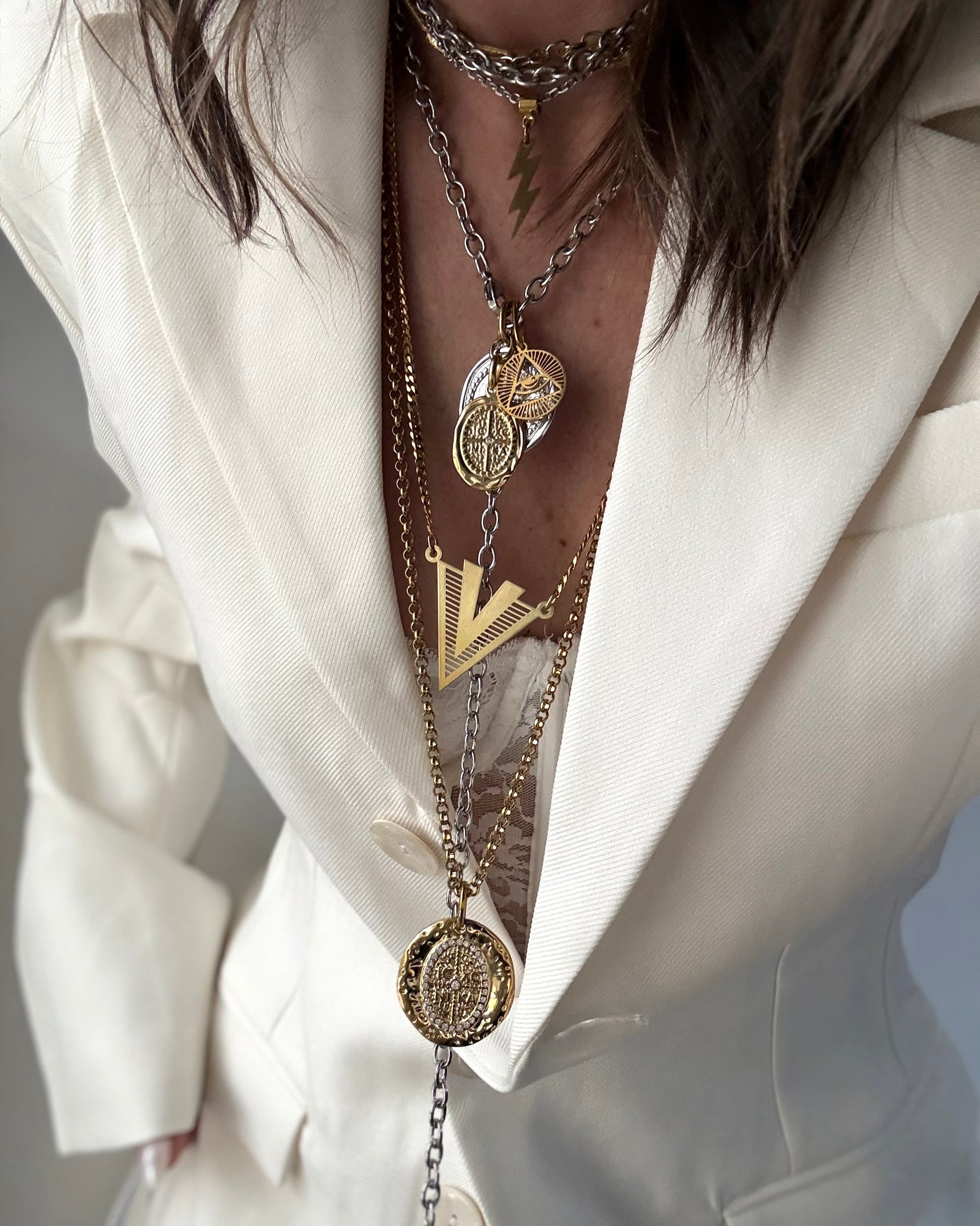 Δυναμικό κολιέ με τρία ξεχωριστά charms που δίνουν ένταση και στυλ σε κάθε εμφάνιση. Η chunky αλυσίδα σε mix χρυσού και ασημί δημιουργεί ένα σύγχρονο αποτέλεσμα που φοριέται από το πρωί μέχρι το βράδυ. Μπορείς να το φορέσεις μακρύ για effortless layering ή σε στυλ “γραβάτας” για πιο statement look. Ένα κόσμημα που προσαρμόζεται στο στυλ σου και τραβάει τα βλέμματα.