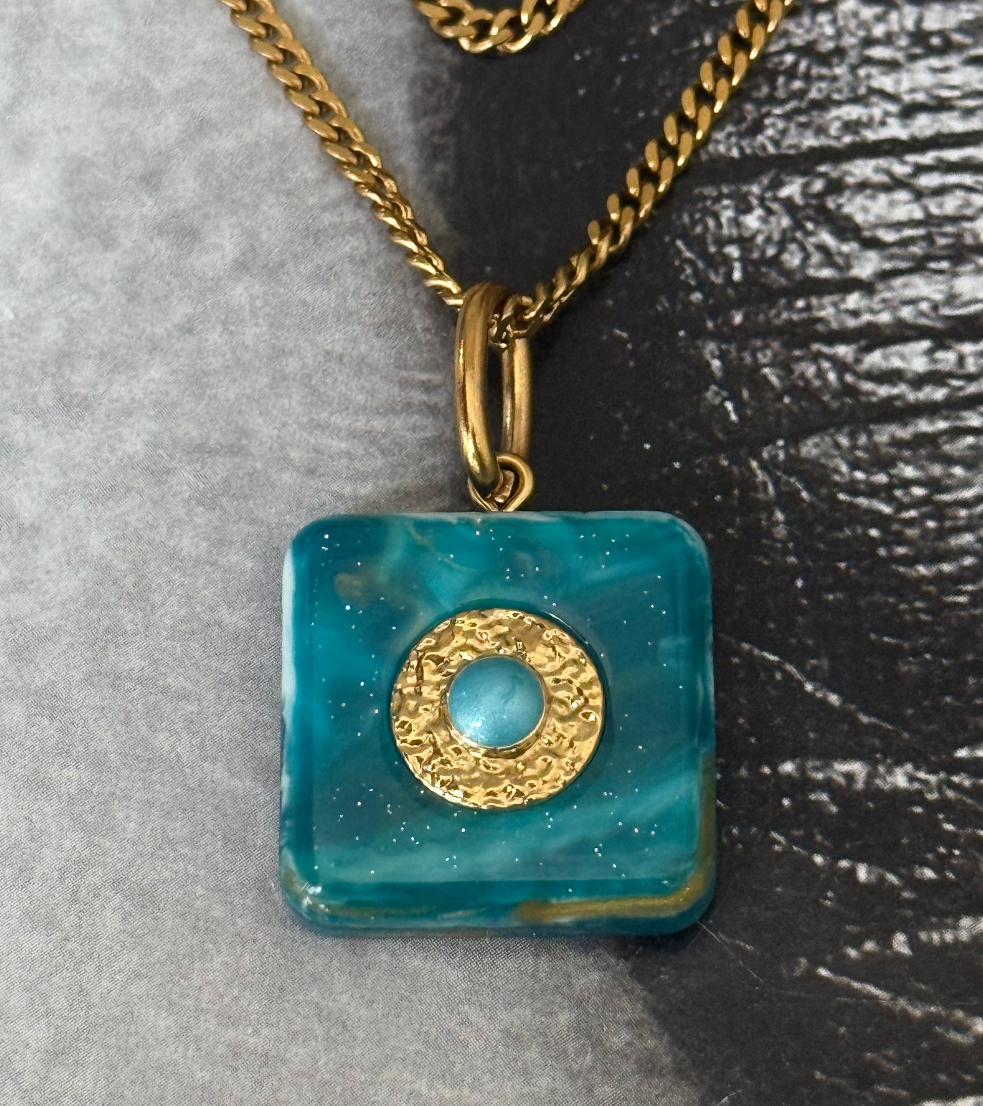 Ένα μακρύ κολιέ που τραβάει το βλέμμα με την πρώτη ματιά. Η έντονη τιρκουάζ απόχρωση συνδυάζεται με χρυσές λεπτομέρειες, δημιουργώντας ένα κομμάτι με χαρακτήρα και φως.