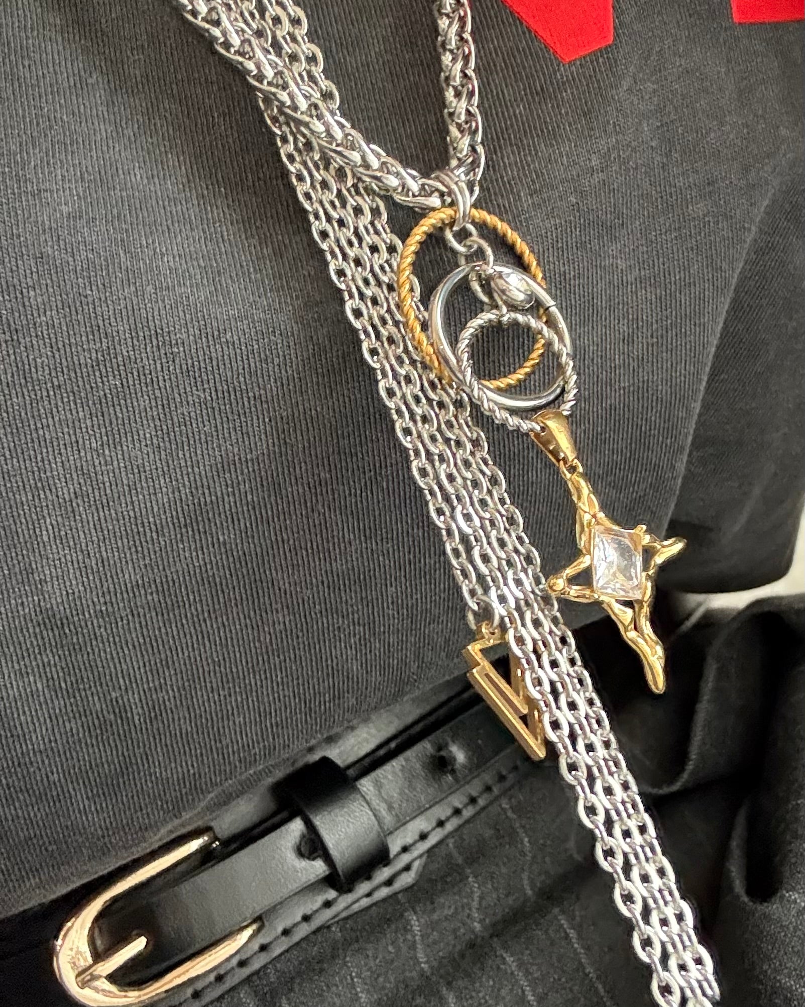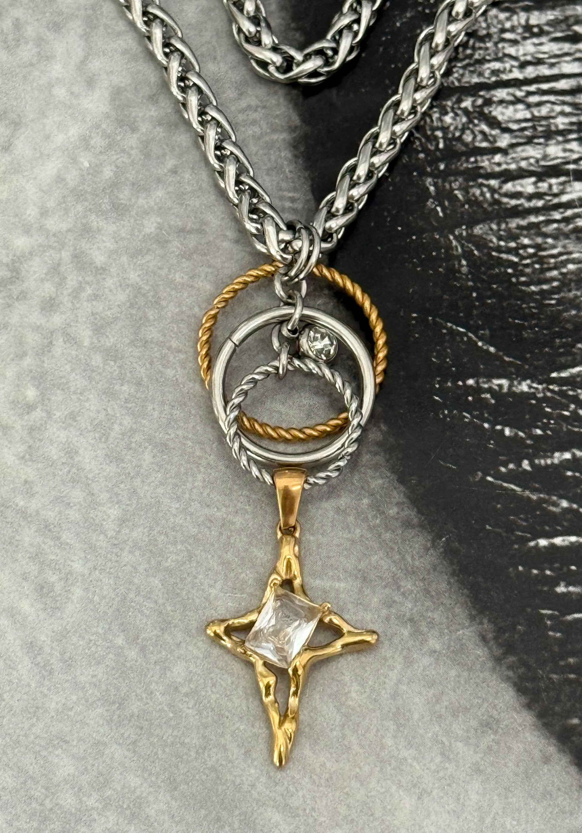 Δυναμικό μακρύ κολιέ με χοντρή αλυσίδα και εντυπωσιακό charm από συνδυασμό μεταλλικών κρίκων και χρυσό στοιχείο σταυρού με πέτρα. Ιδανικό για να απογειώσεις ένα απλό outfit ή να δώσεις edgy πινελιά σε κάθε layering.