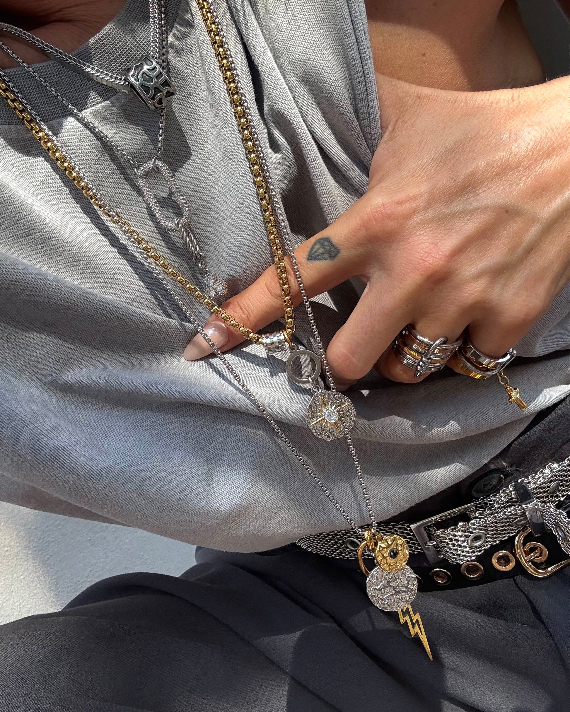 Ένα κοντό κολιέ με ιδιαίτερο γεωμετρικό μοτίβο που συνδυάζει minimal αισθητική με δυναμικό χαρακτήρα. Η μοναδική του υφή και το bold design το κάνουν ιδανικό για καθημερινά looks με urban edge αλλά και για layered συνδυασμούς που ξεχωρίζουν. Ιδανικό για layering με αλυσίδες διαφορετικών μηκών για statement αποτέλεσμα.