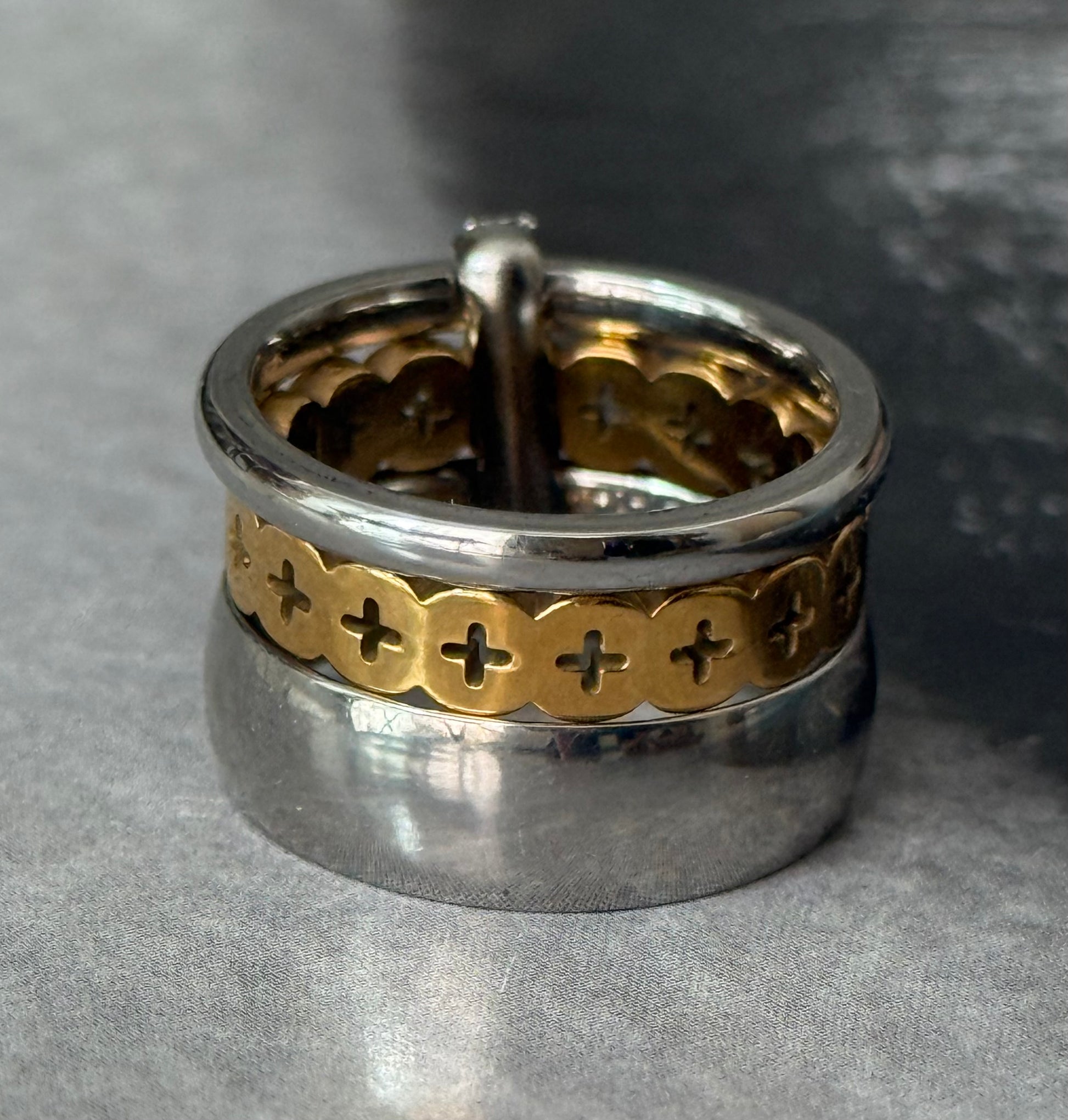 Ένα μοναδικό δαχτυλίδι που παίζει με τις αντιθέσεις των μετάλλων , συνδυάζοντας το θερμό χρυσό και το ψυχρό ασημί .
