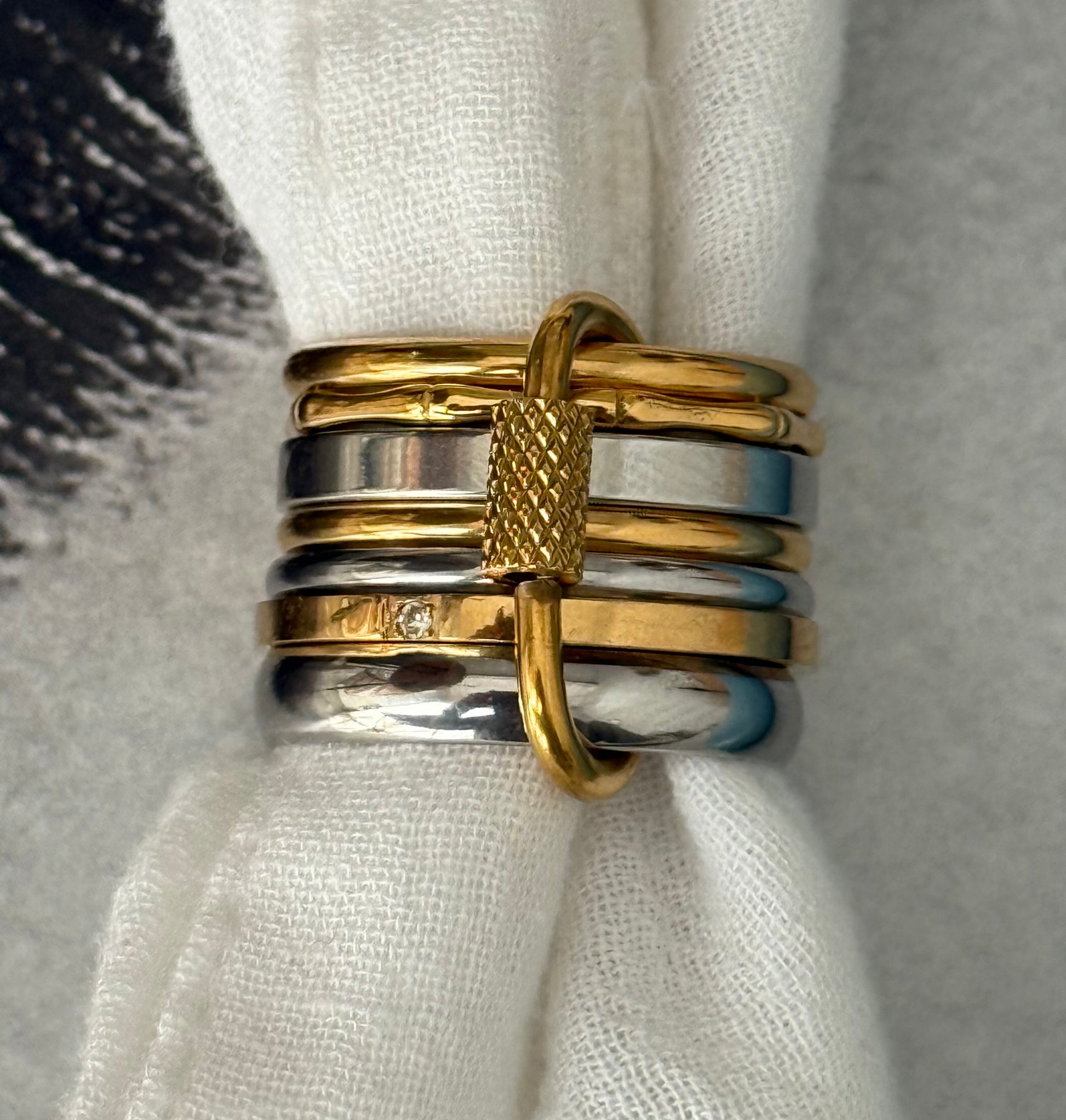 Αποτελείται από 7 διαφορετικά σχέδια σε αποχρώσεις ασημί και χρυσού, δεμένα μεταξύ τους με μεταλλικό κρίκο που ολοκληρώνει το σύνολο με industrial αισθητική.Ένα κόσμημα με προσωπικότητα — το φοράς ενιαίο, το νιώθεις ξεχωριστό.