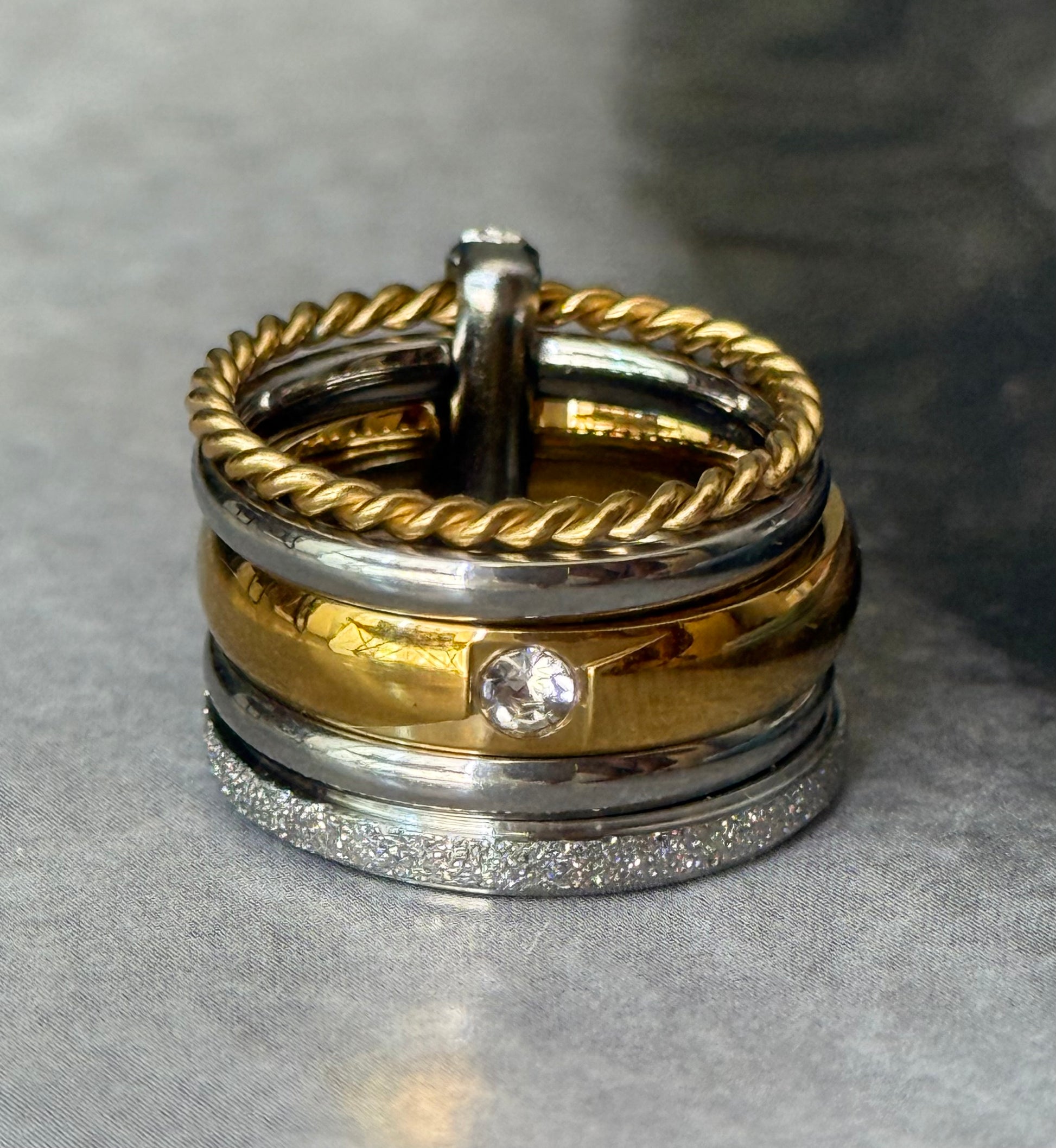 Ένα εντυπωσιακό δαχτυλίδι που συνδυάζει χρυσές και ασημί αποχρώσεις. Ιδανικό για μια εκλεπτυσμένη μοντέρνα εμφάνιση.