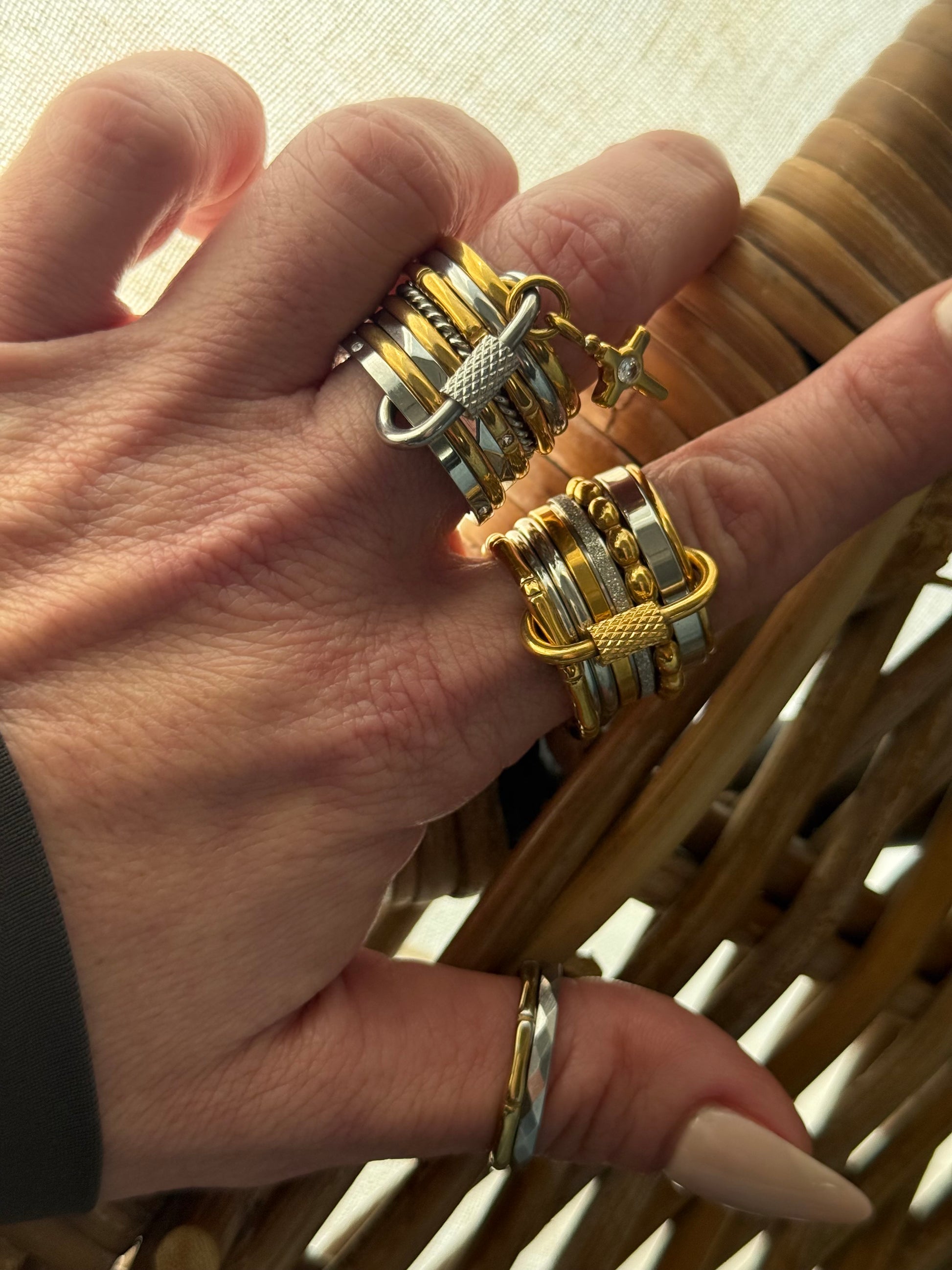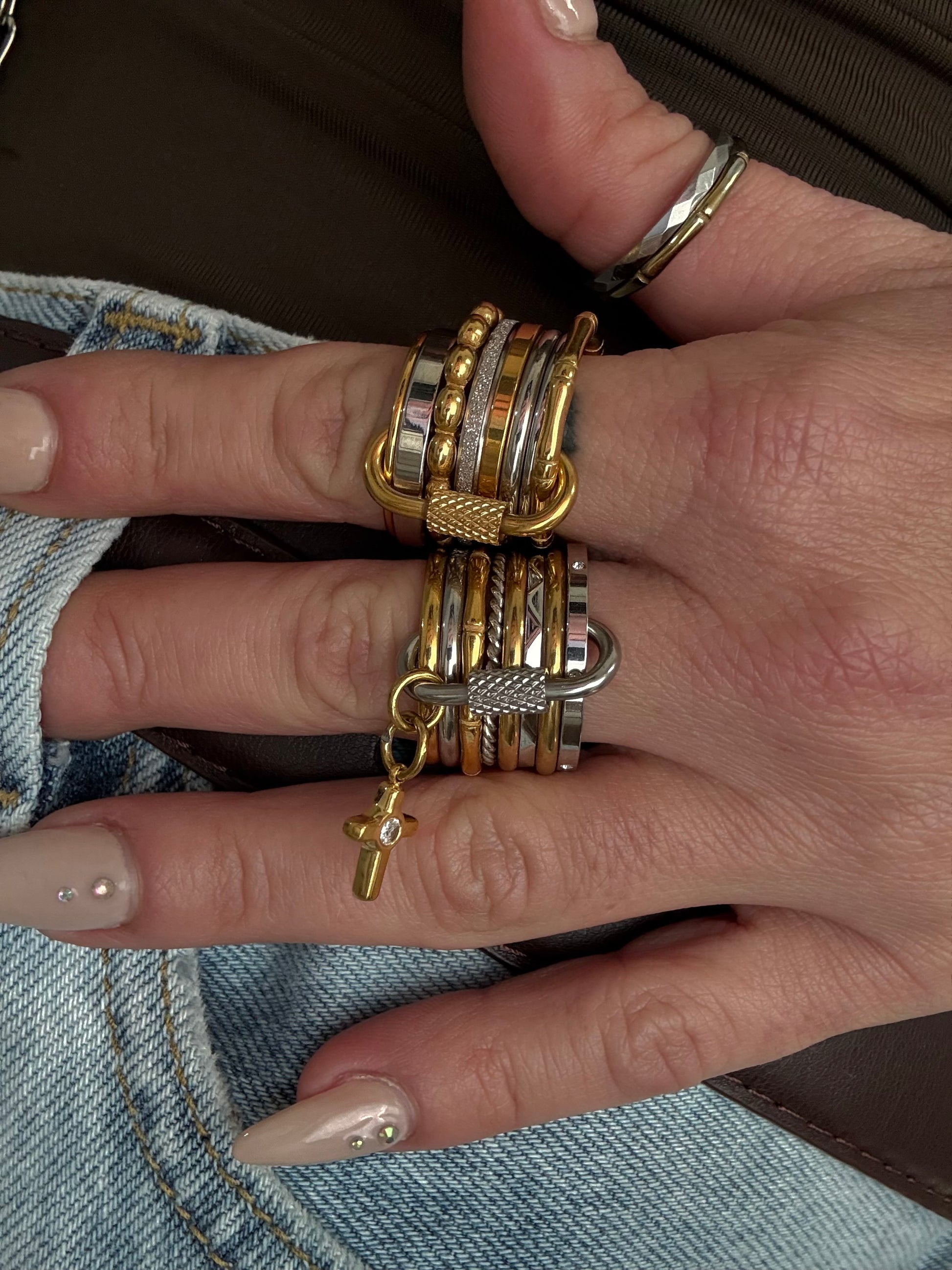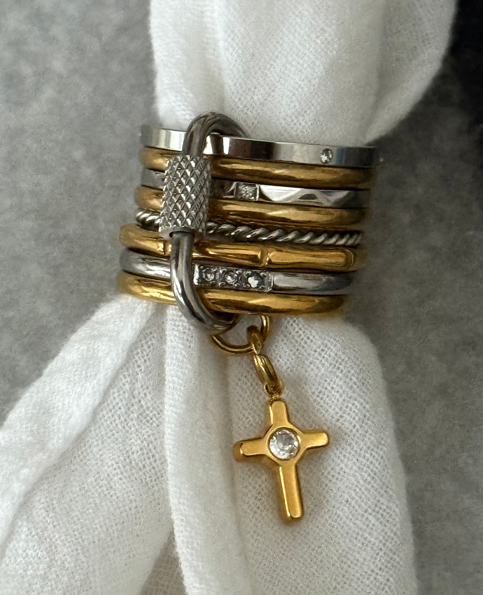 Αποτελείται από 8 διαφορετικά σχέδια σε αποχρώσεις ασημί και χρυσού, δεμένα μεταξύ τους με μεταλλικό κρίκο που ολοκληρώνει το σύνολο με industrial αισθητική.Το διακριτικό charm με σταυρό προσθέτει κίνηση και λάμψη.Ένα κόσμημα με προσωπικότητα — το φοράς ενιαίο, το νιώθεις ξεχωριστό.