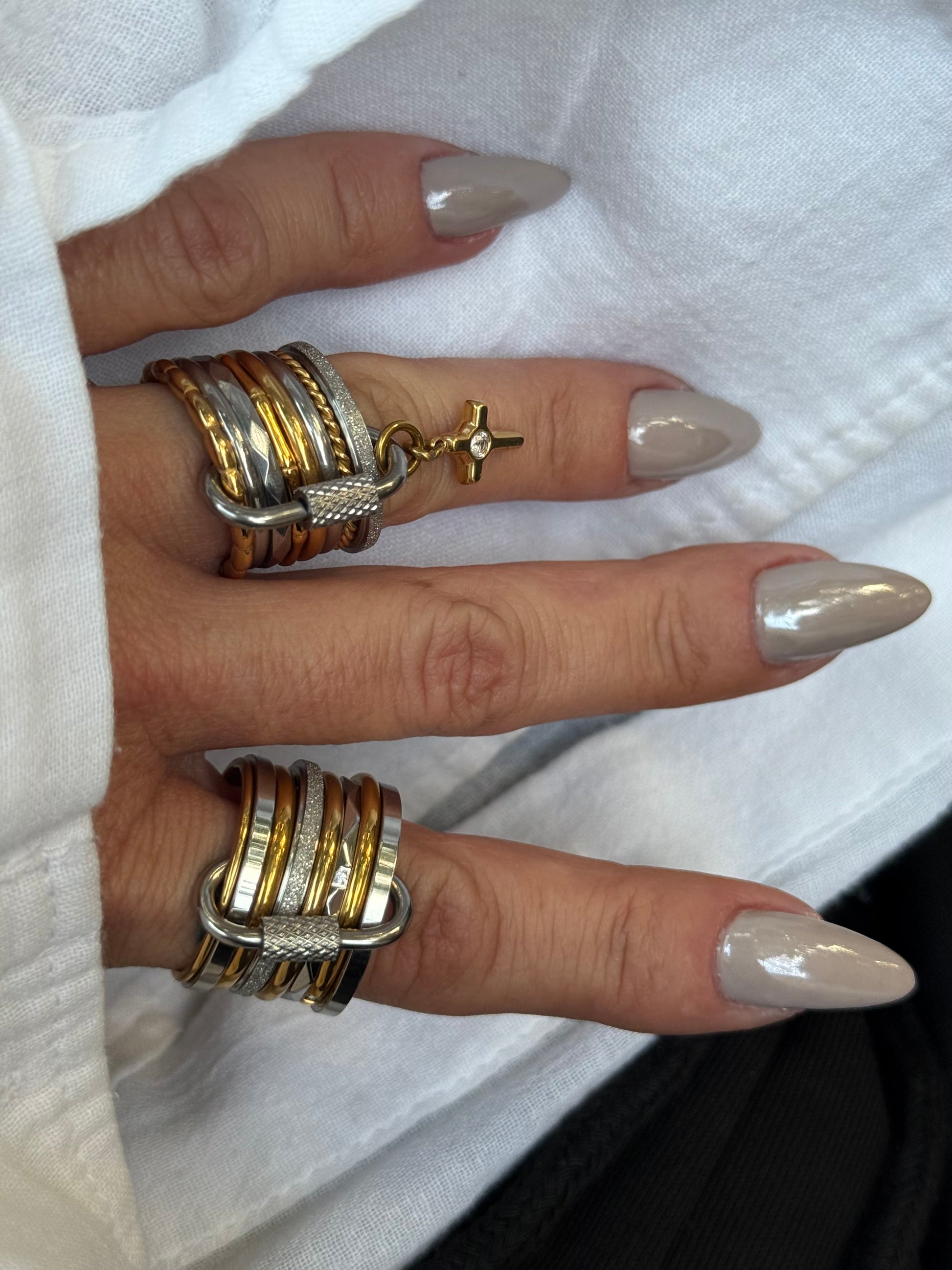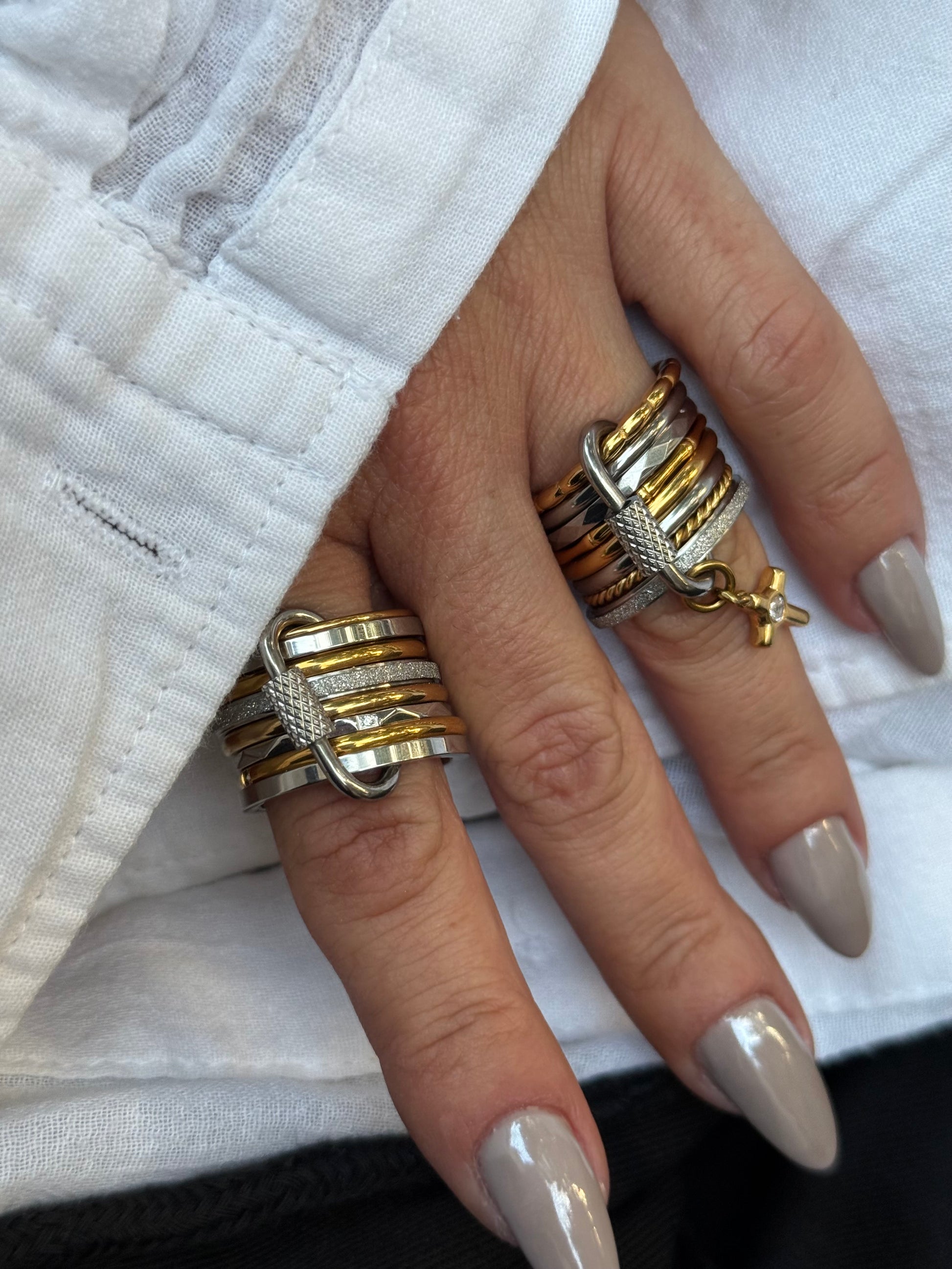 Αποτελείται από 8 διαφορετικά σχέδια σε αποχρώσεις ασημί και χρυσού, δεμένα μεταξύ τους με μεταλλικό κρίκο που ολοκληρώνει το σύνολο με industrial αισθητική.Το διακριτικό charm με σταυρό προσθέτει κίνηση και λάμψη.Ένα κόσμημα με προσωπικότητα — το φοράς ενιαίο, το νιώθεις ξεχωριστό.
