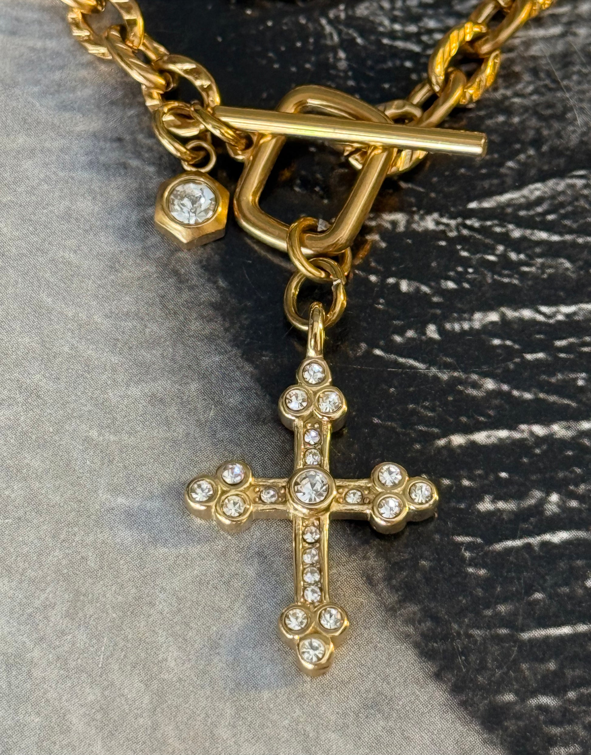 Κολιέ με statement αλυσίδα και κούμπωμα μπροστά, που μετατρέπει τη λεπτομέρεια σε πρωταγωνιστή. Ο διακοσμητικός σταυρός με λαμπερές πέτρες προσθέτει συμβολισμό και δυναμικό χαρακτήρα, ενώ το front clasp επιτρέπει να φορεθεί μόνο του ή ως βάση για layering. Ένα κόσμημα που ισορροπεί ανάμεσα στο διαχρονικό και το σύγχρονο, ιδανικό για κάθε στιγμή της ημέρας.