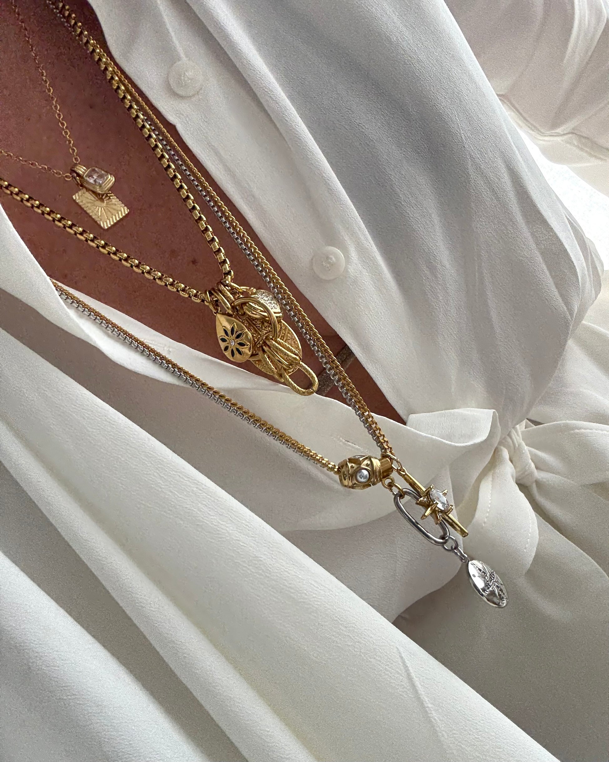 Το Delicate Layers Necklace συνδυάζει minimal στοιχεία σε μια λεπτή αλυσίδα, δημιουργώντας ένα κόσμημα που φοριέται εύκολα και ταιριάζει με κάθε στιλ. Οι καθαρές γραμμές και οι μικρές λεπτομέρειες το καθιστούν ιδανικό για layering, αλλά και εξίσου όμορφο φορεμένο μόνο του.