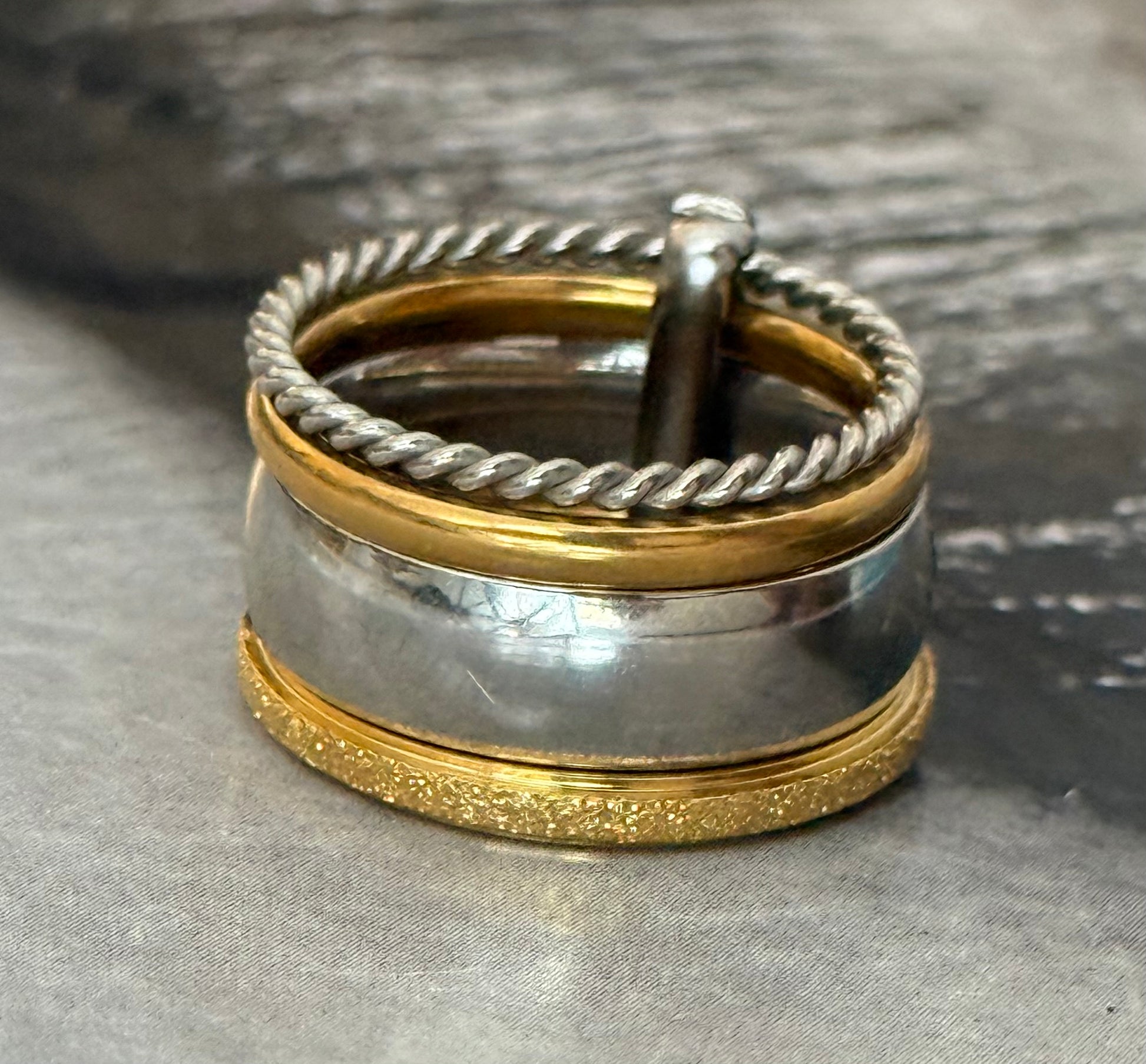 Ένα minimal δαχτυλίδι που συνδυάζει την πολυτέλεια του χρυσού με την μοντέρνα κομψότητα του ασημιού . Ιδανικό για layering ή ως statement piece .