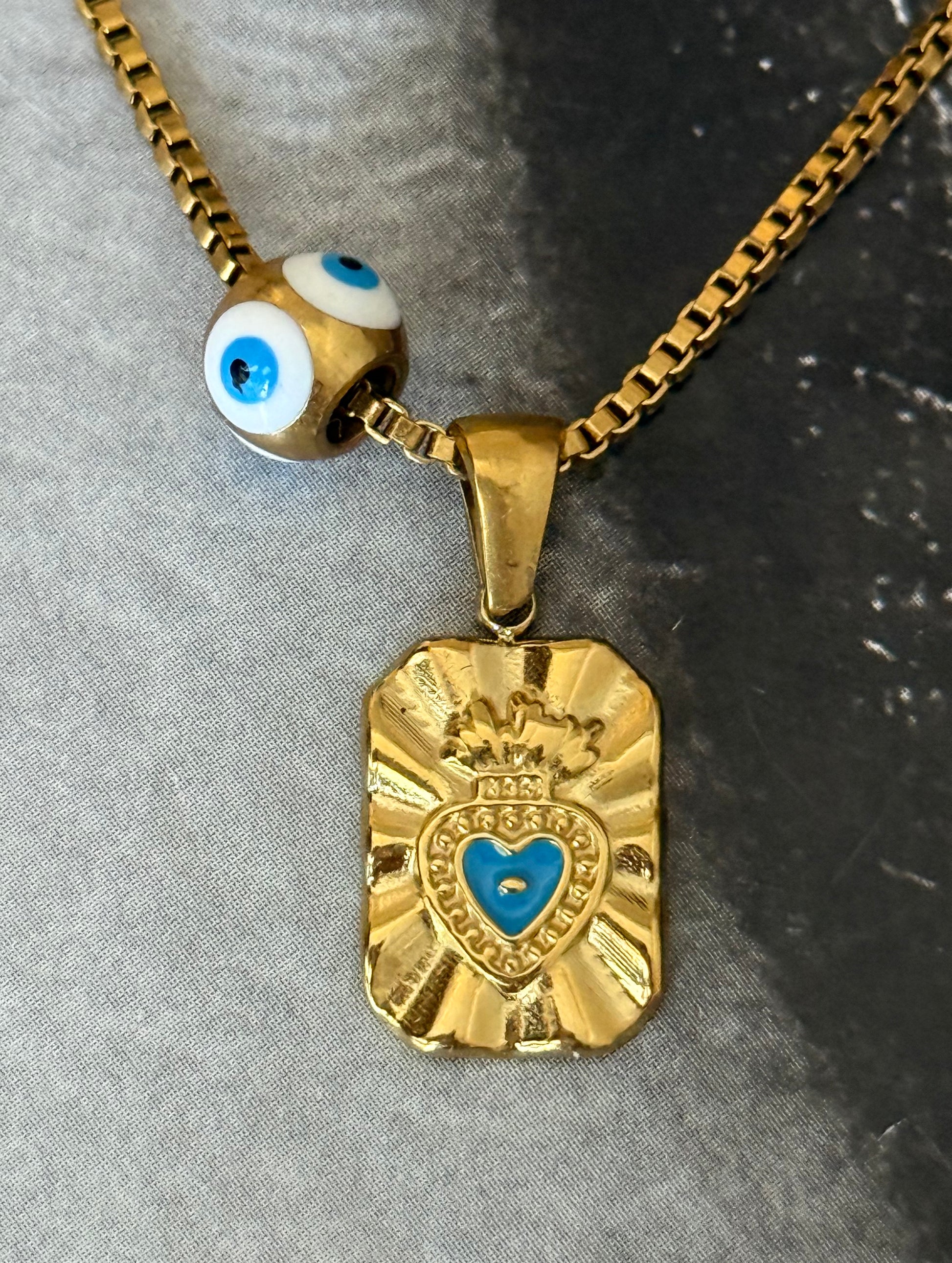 Κοντό χρυσό κολιέ με μενταγιόν σε σχήμα καρδιάς και λεπτομέρεια από μπλε σμάλτο. Συνοδεύεται από διακριτική χάντρα-μάτι, που προσθέτει μια πινελιά προστασίας και καλοκαιρινής ενέργειας.