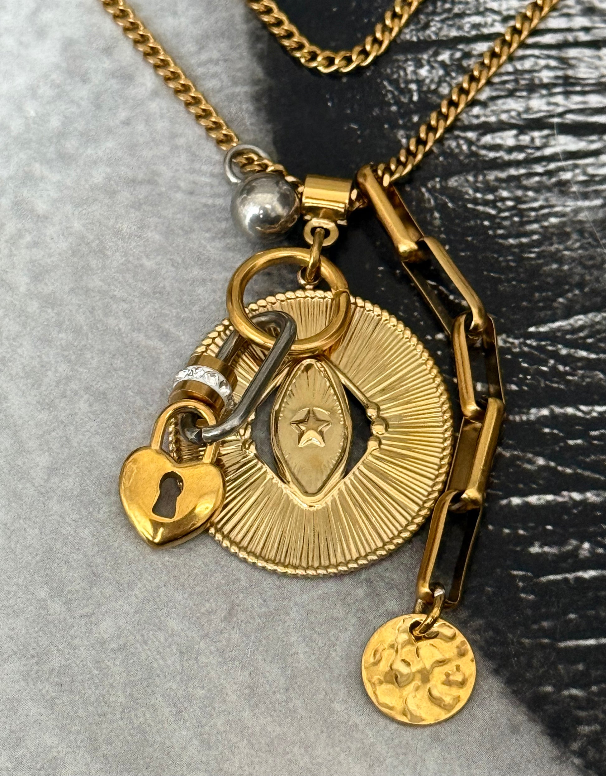 Ένα μακρύ κολιέ που δεν περνά απαρατήρητο. Μάτι και λουκέτο-καρδιά σε εντυπωσιακό συνδυασμό χρυσών αποχρώσεων, για εμφανίσεις με δύναμη, στυλ και προσωπικότητα.
