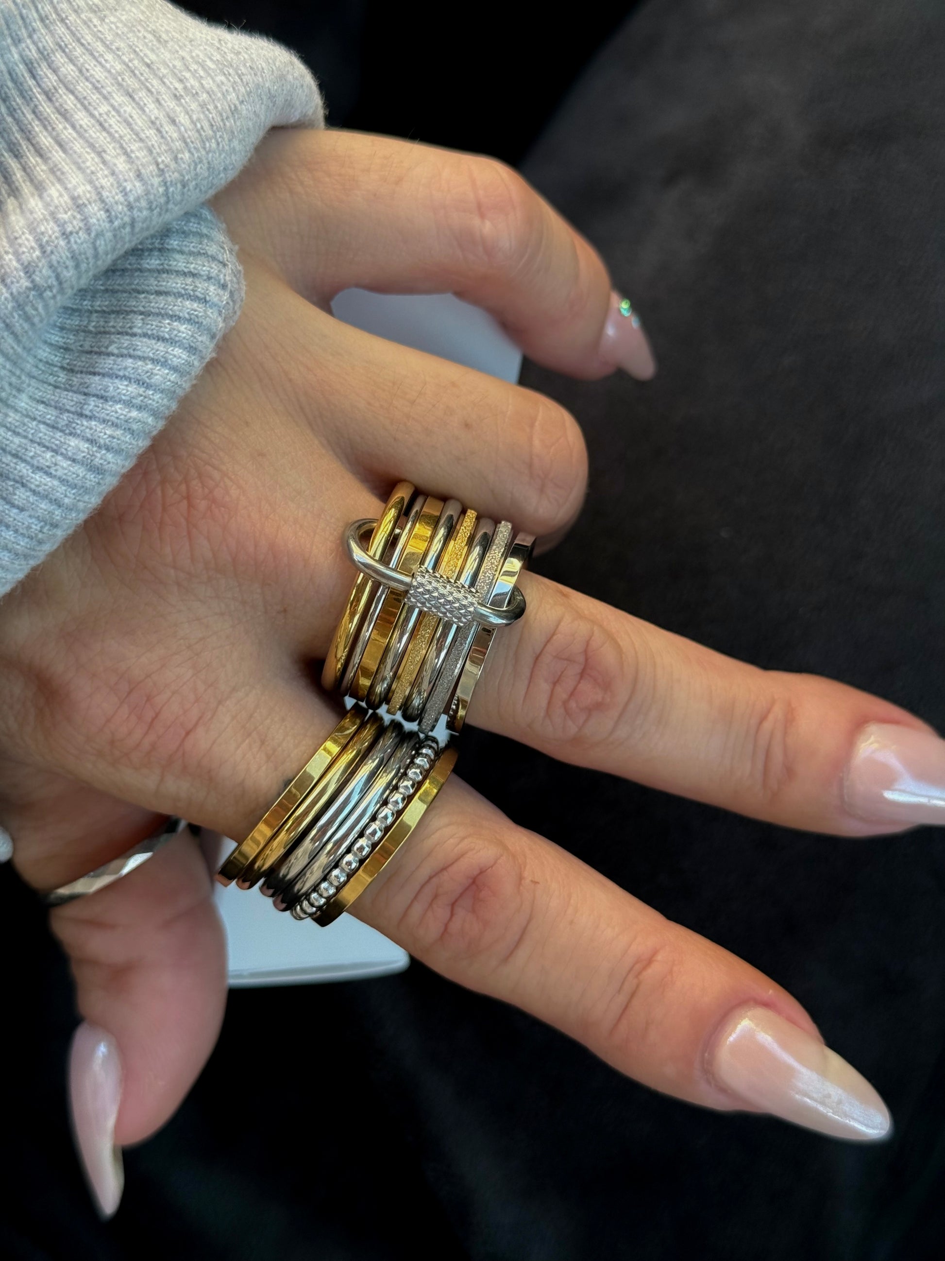Ένα εκλεπτυσμένο εξαπλο δαχτυλίδι που συνδυάζει την κομψότητα του χρυσού και του ασημιού σε ένα μοναδικό σχεδιασμό . Ιδανικό για κάθε περίσταση.