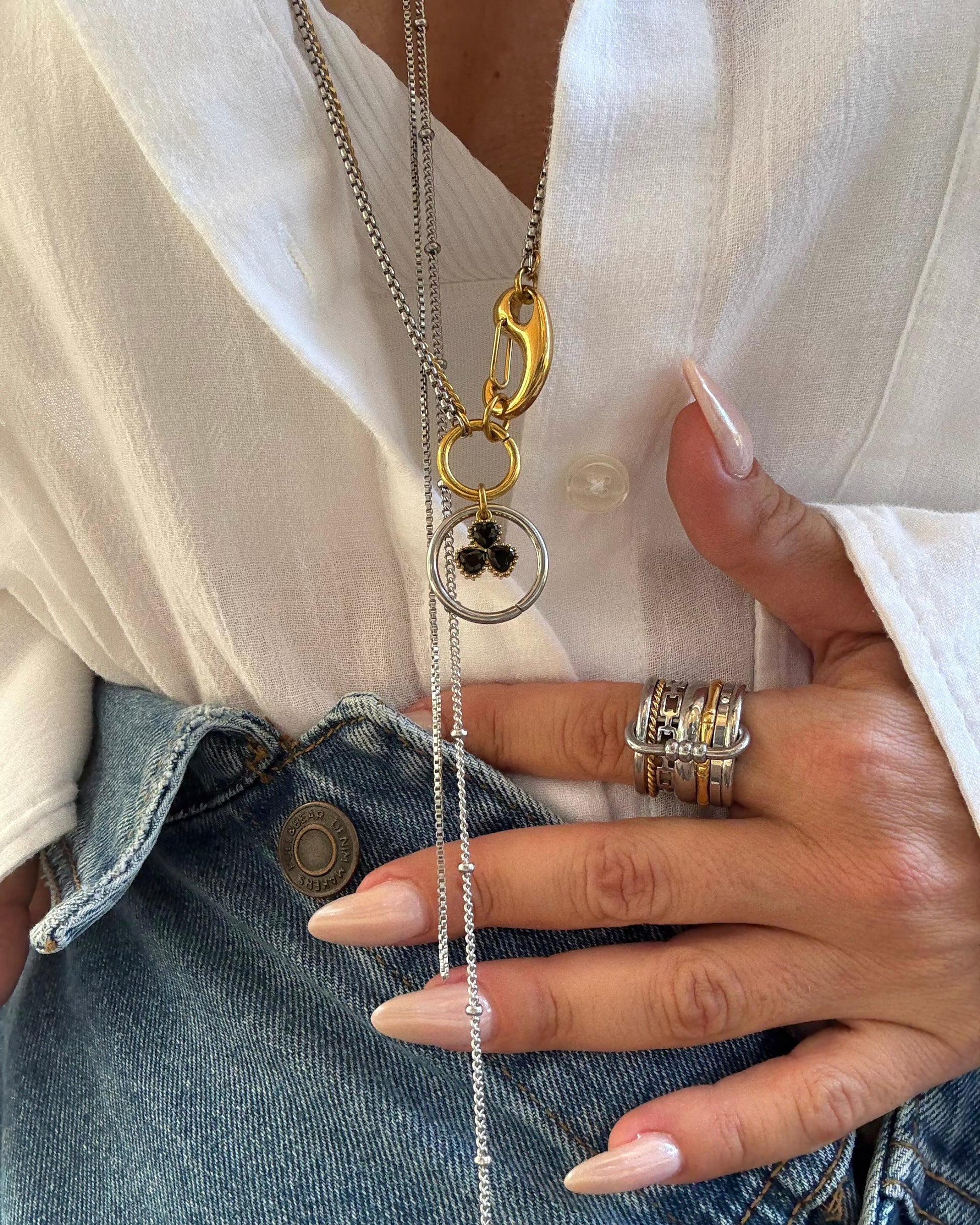 Διπλή αλυσίδα σε χρυσούς και ασημένιους τόνους με γούρι μαύρο τριφύλλι. Ένα κομμάτι που παίζει με το mix and match στυλ, δίνοντας μοντέρνο και παιχνιδιάρικο χαρακτήρα. Μπορεί να φορεθεί είτε μακρύ για πιο χαλαρό look είτε τυλιγμένο διπλά γύρω από τον λαιμό σαν choker για πιο εντυπωσιακό αποτέλεσμα.
