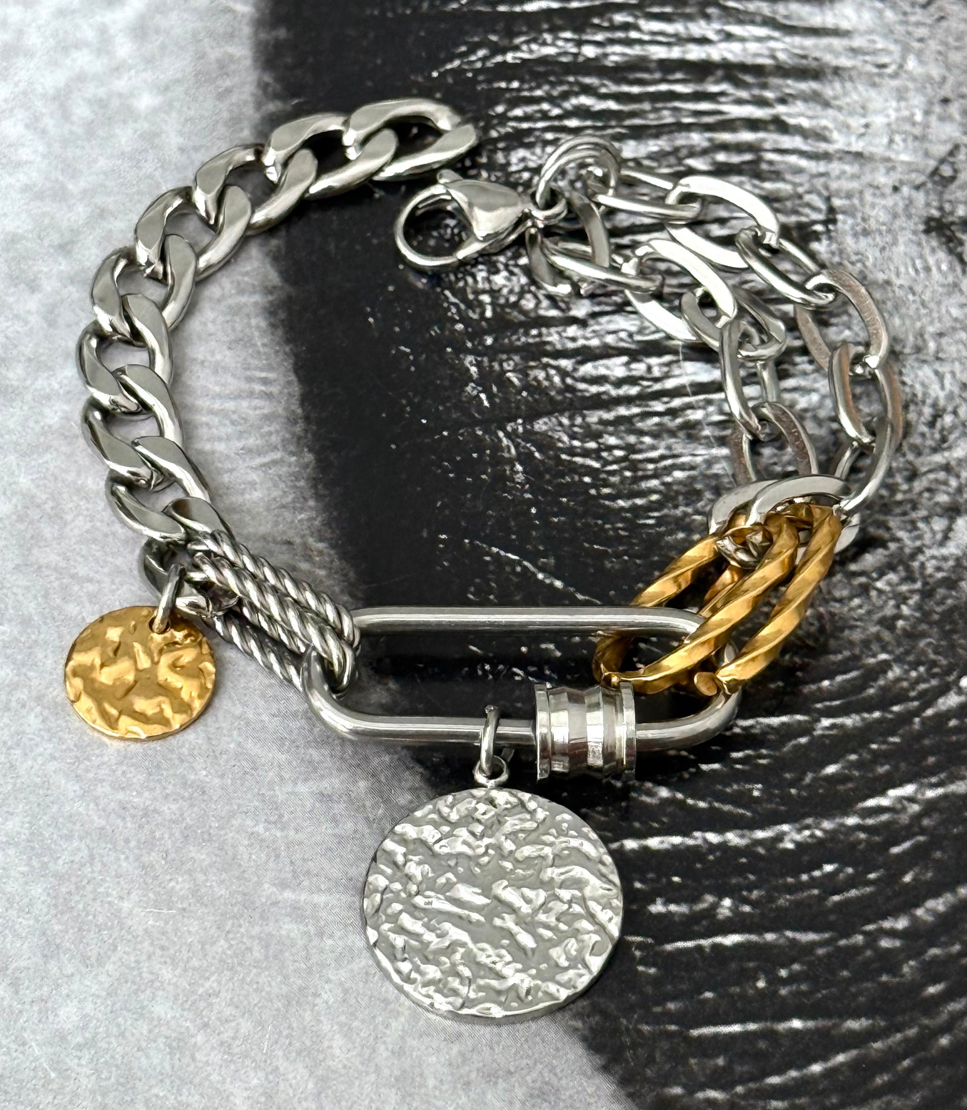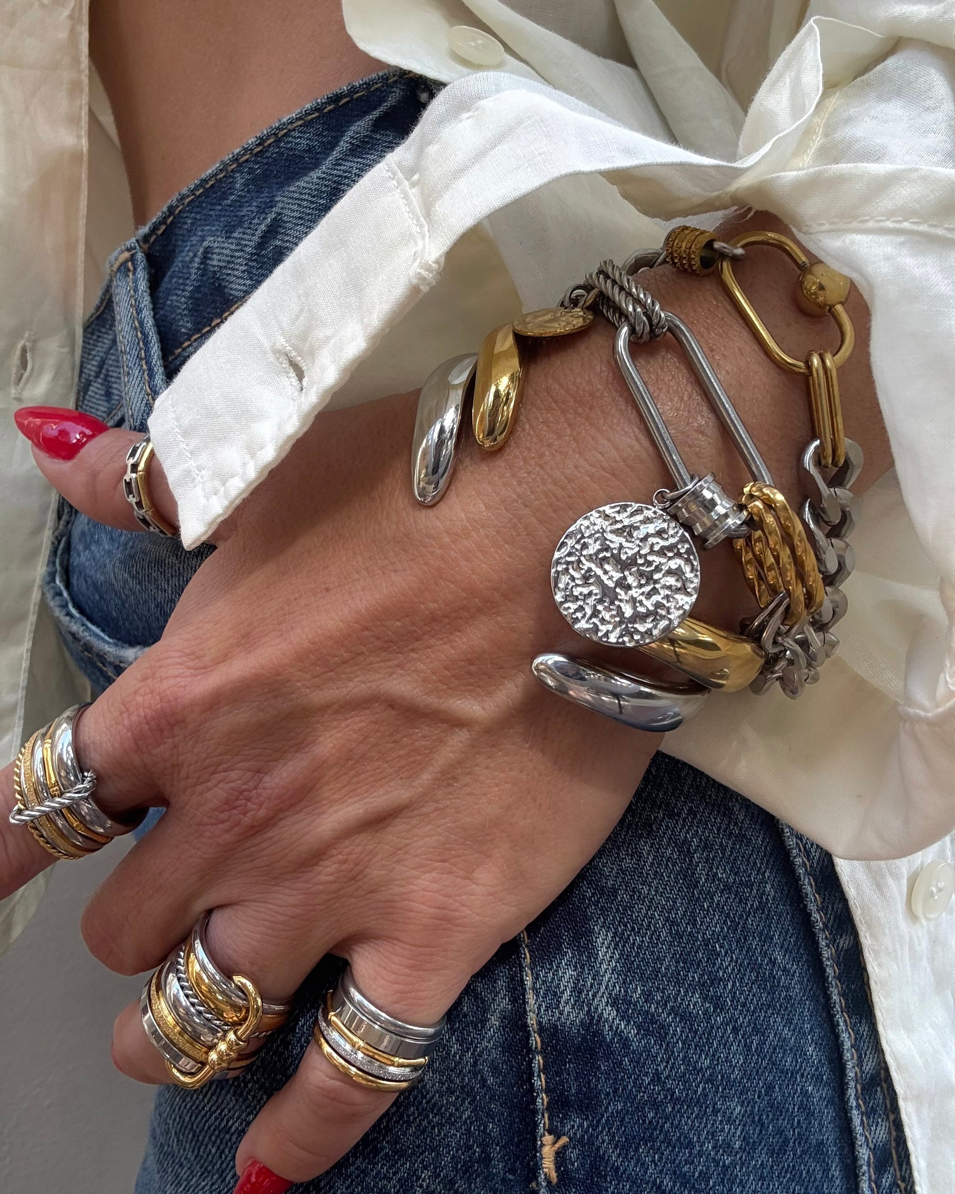 Ένα statement βραχιόλι που συνδυάζει το ασημί με το χρυσό σε ένα εκρηκτικό mix. Οι hammered λεπτομέρειες δίνουν μια edgy υφή, ενώ οι διπλές αλυσίδες και τα charms απογειώνουν κάθε look. Ιδανικό για layering αλλά και για solo εμφάνιση που δεν περνά απαρατήρητη.
