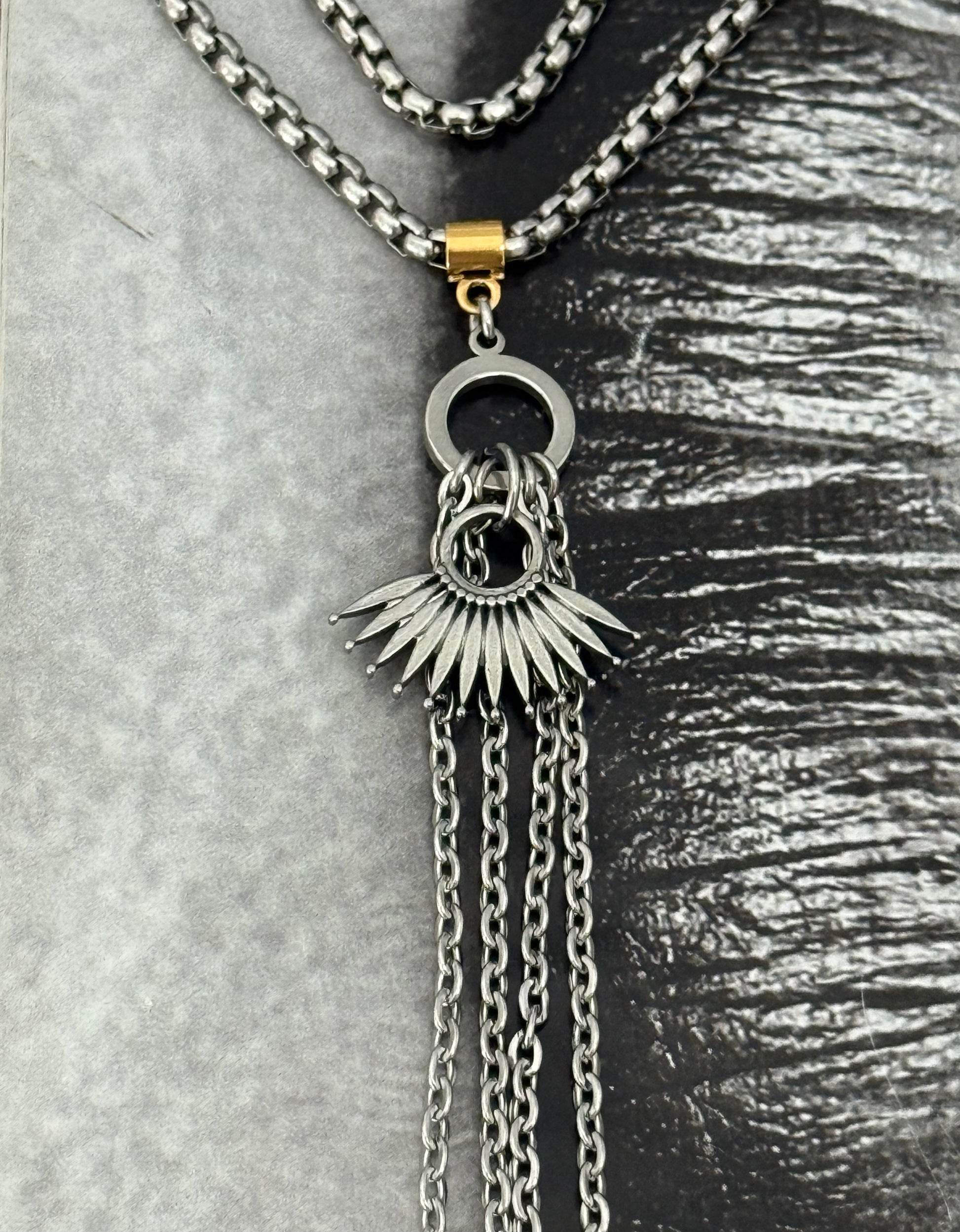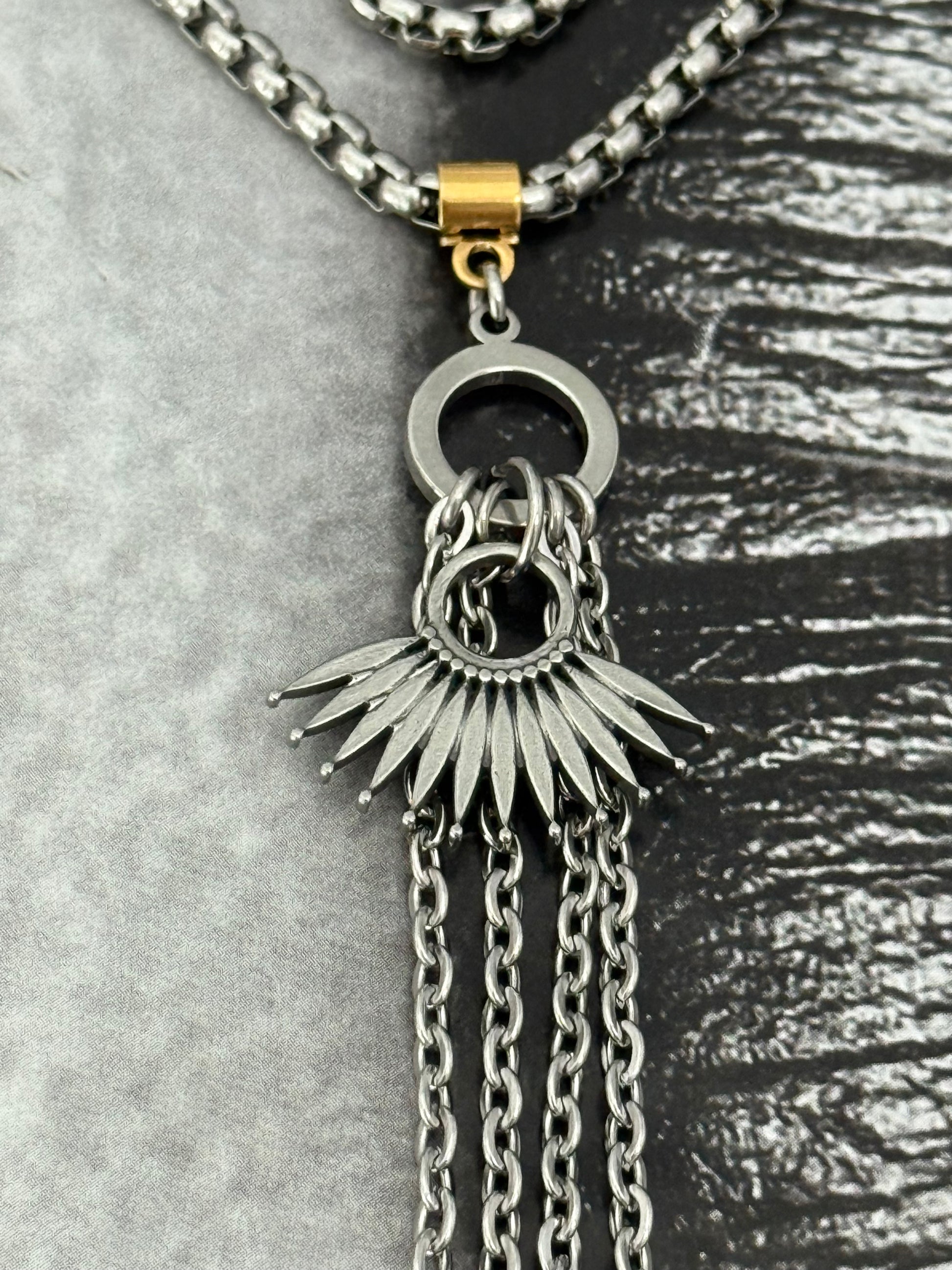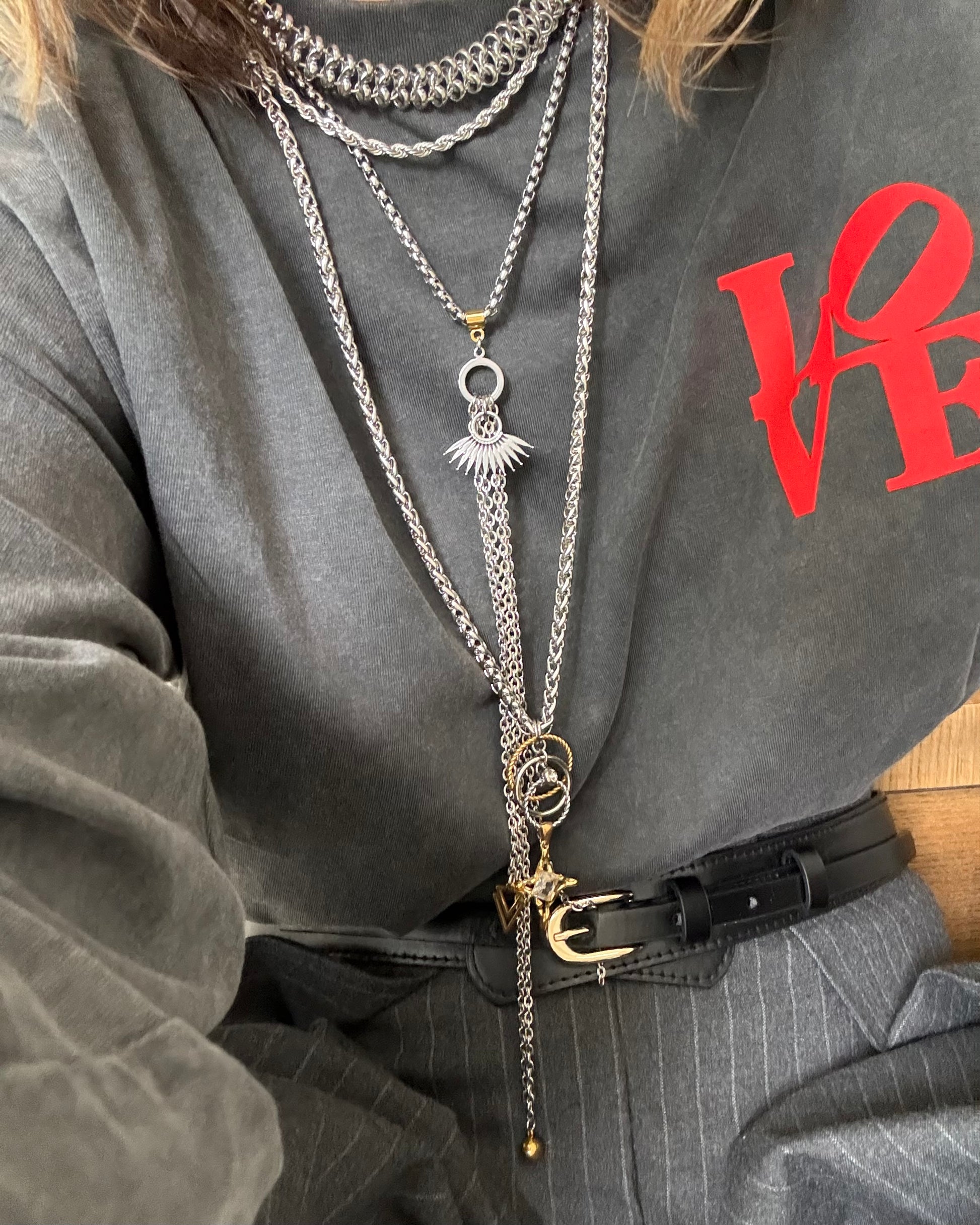 Εντυπωσιακό κολιέ–γραβάτα με αλυσίδες διαφορετικού μήκους που κινούνται με κάθε σου κίνηση. Ο συνδυασμός των μεταλλικών στοιχείων και των layered λεπτομερειών δημιουργεί ένα δυναμικό, industrial αποτέλεσμα με γυναικείο edge.