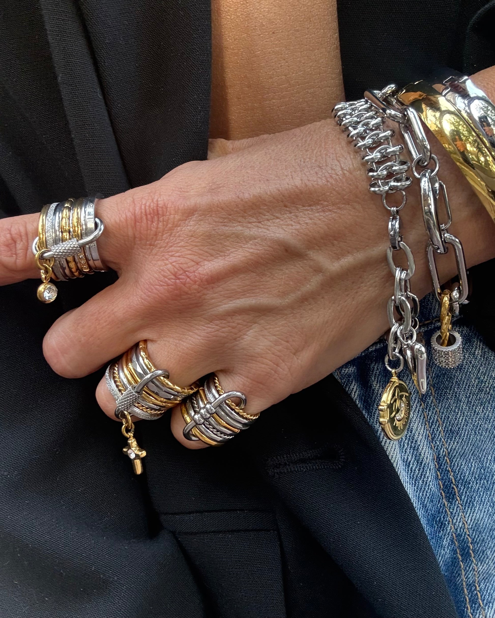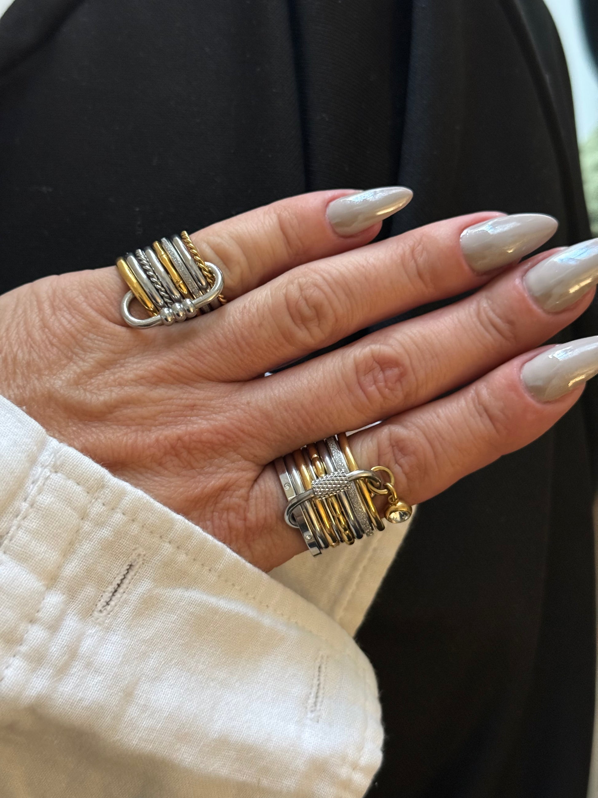 Αποτελείται από 8 διαφορετικά σχέδια σε αποχρώσεις ασημί και χρυσού, δεμένα μεταξύ τους με μεταλλικό κρίκο που ολοκληρώνει το σύνολο με industrial αισθητική.Ένα κόσμημα με προσωπικότητα — το φοράς ενιαίο, το νιώθεις ξεχωριστό.