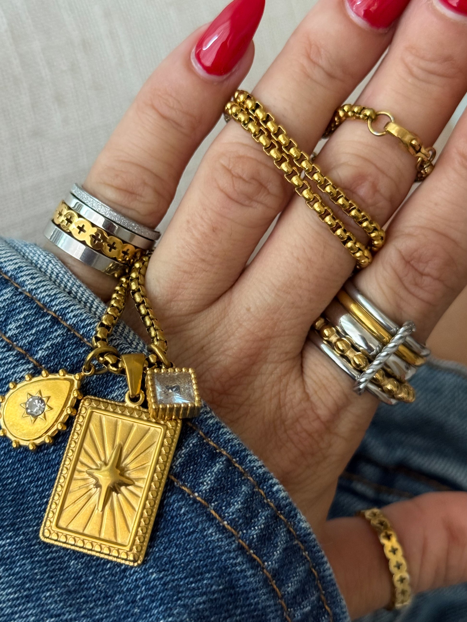 Minimal δαχτυλιδι τετραπλο σε χρυσό και ασημί αποχρώσεις . Μοντέρνος σχεδιασμός με κομψές λεπτομέρειες ιδανικό για layering ή ως statement piece.