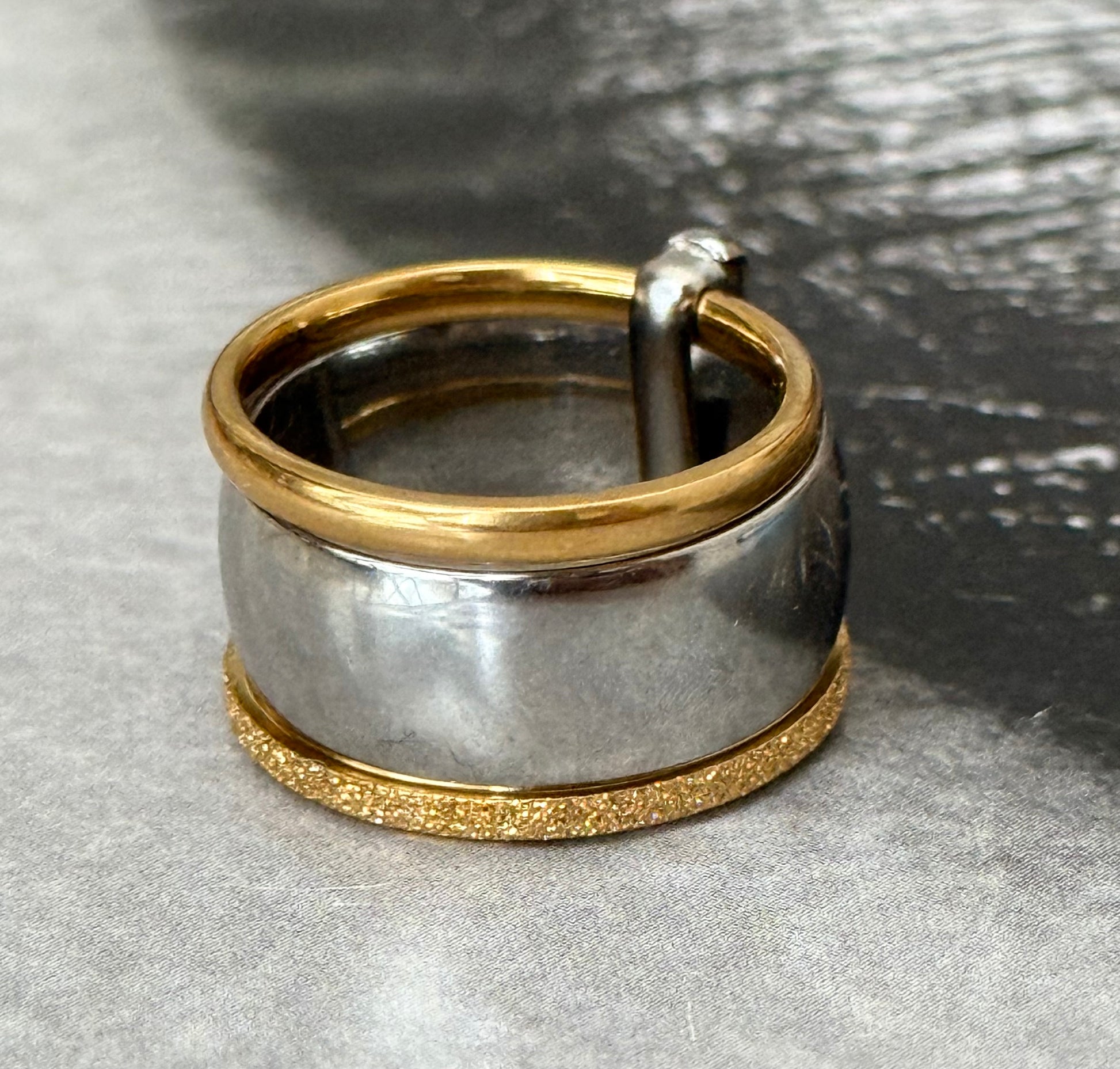 Ένα minimal δαχτυλιδι που ισορροπεί ανάμεσα στη λάμψη και την κομψότητα . Τα δαχτυλίδια εναλλάσσονται από ζεστό χρυσό σε ψυχρό ασημί ώστε να δημιουργεί μια μοναδική αντίθεση που μαγνητίζει το βλέμμα.